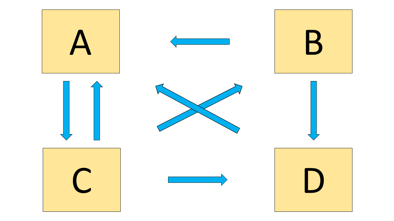 Assume that \(d=1\) and that there are only \(N=4\) websites on the internet: \(A\), \(B\), \(C\) and \(D\). Links are given by the image below. That is, \(A\) has a link to \(C\) only. \(B\) has a link to \(A\) and \(D\). \(C\) has a link to all three other pages. \(D\) has a link to \(A\) only.