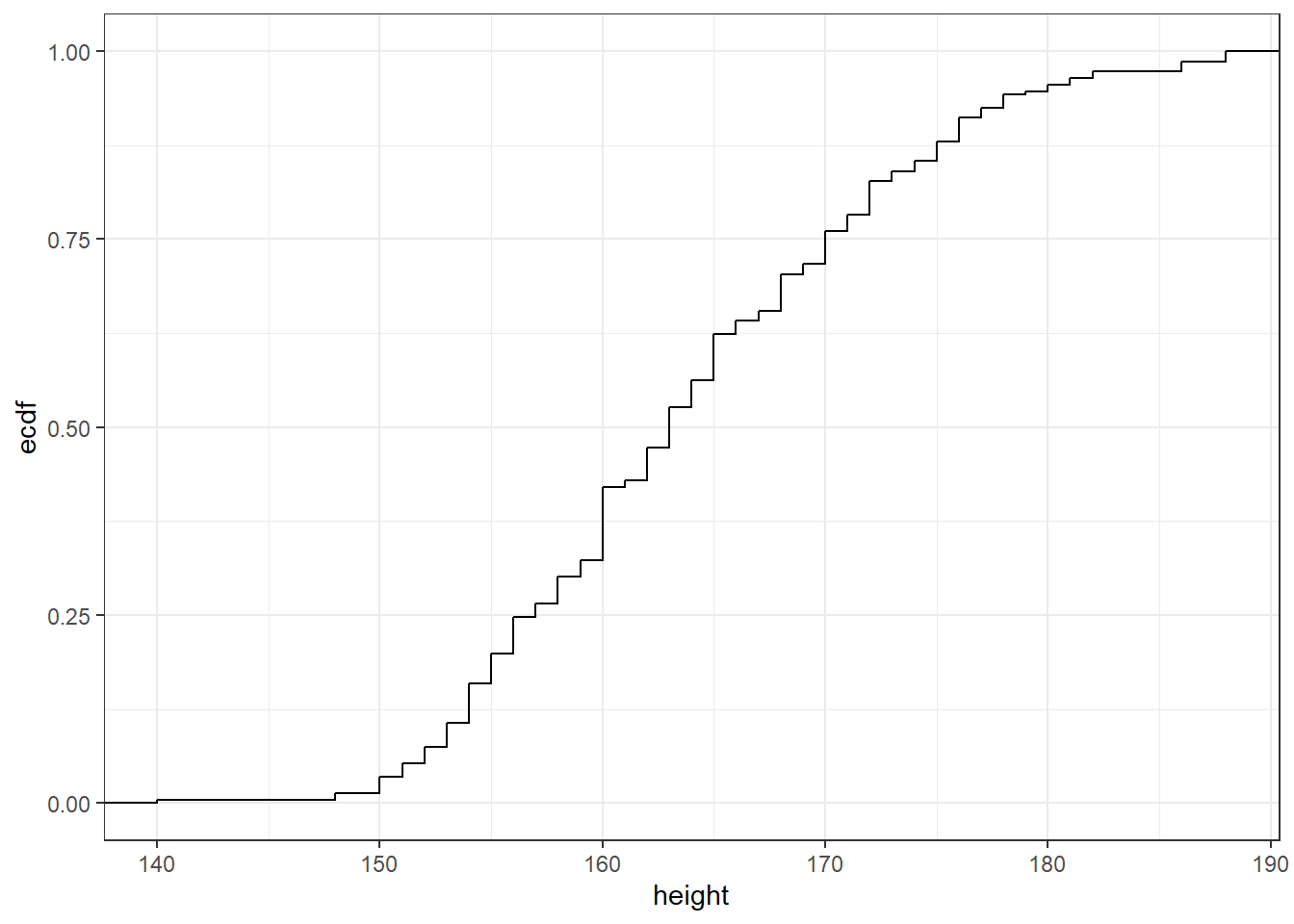 Another type of visual layer you can add with ggplot2 is a stat. For example, you can use the stat_ecdf() to visualise the empirical distribution function of a continuous variable.
