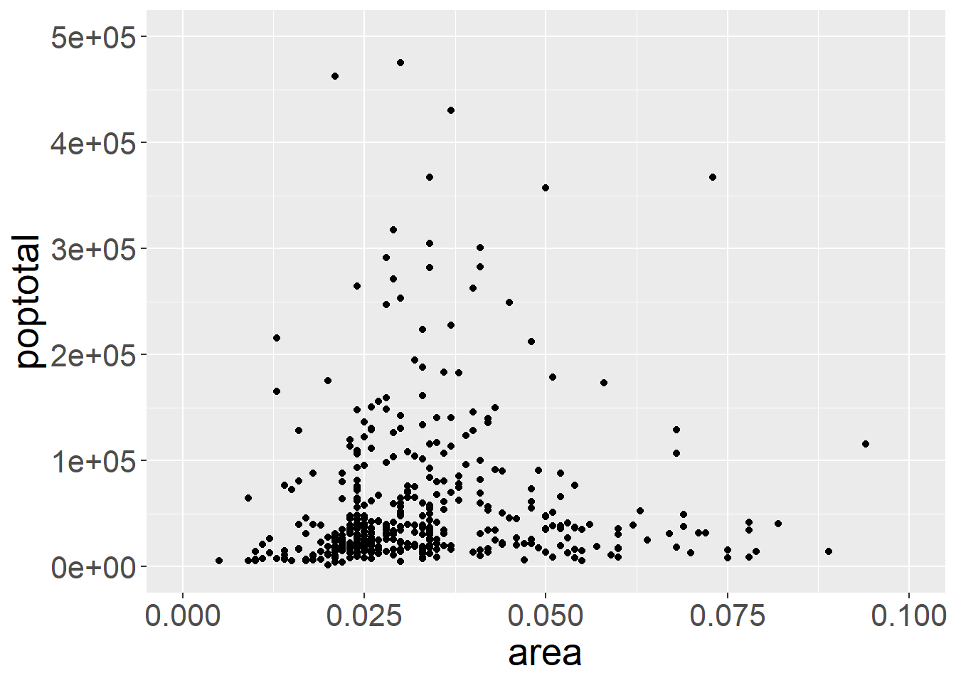 ggplot(midwest, aes(x=area, y=poptotal)) +