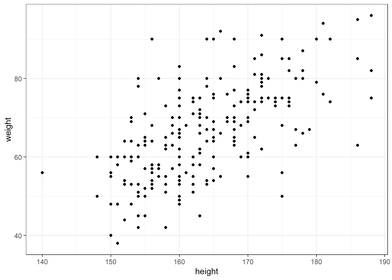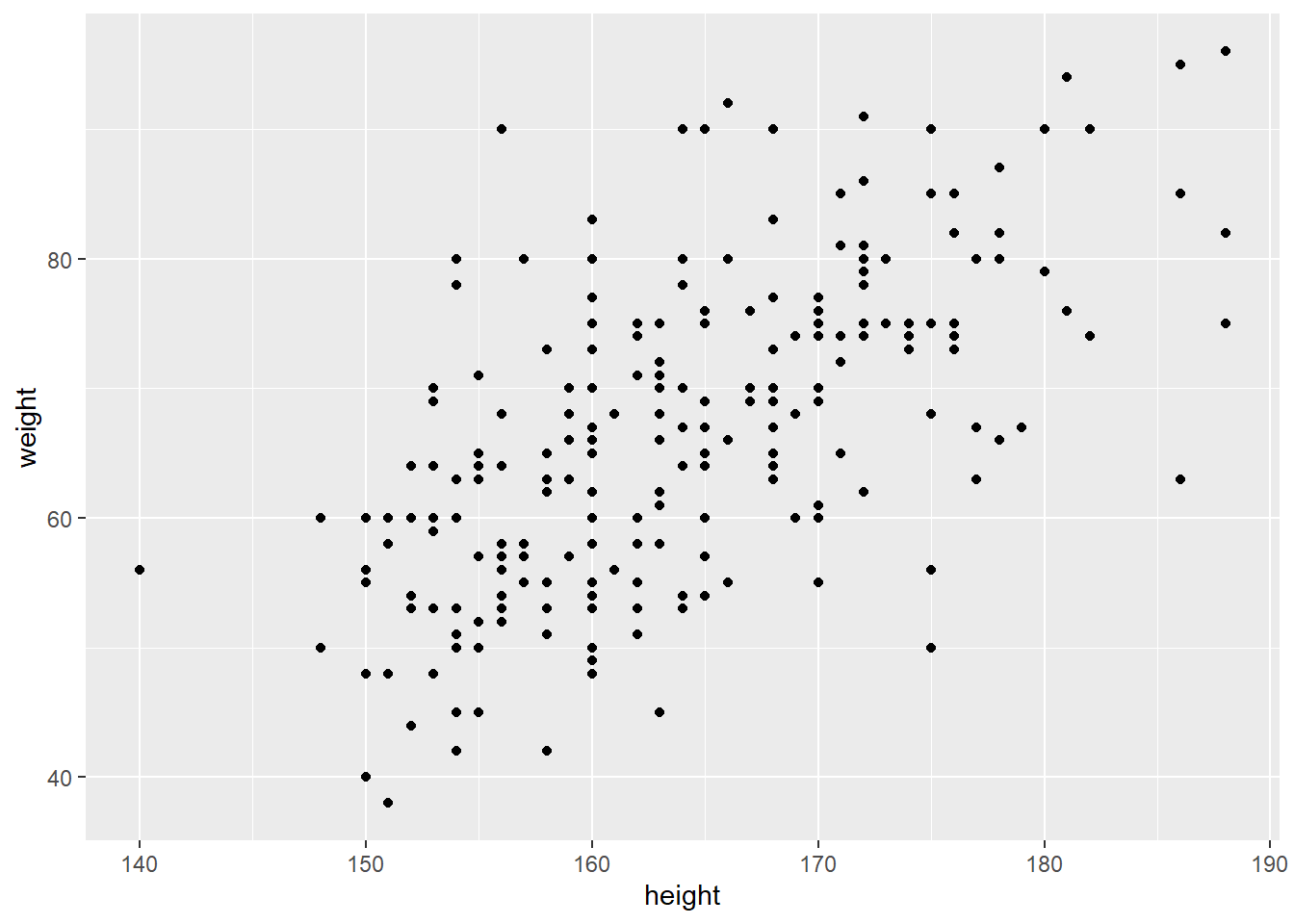 ggplot() function.aes() stands for ‘aesthetic’. Different geoms have different required aesthetics but these are generally features of the visualisation that should be determined by the data.x and y coordinates to be determined by the data, hence we use aes(x = height, y = weight)geom_point is actually “inheriting” the data argument raw_data from ggplot(raw_data). It would be equally valid to write:ggplot() + geom_point(raw_data, aes(x = height, y = weight))We will see more on this and how it can be used later.