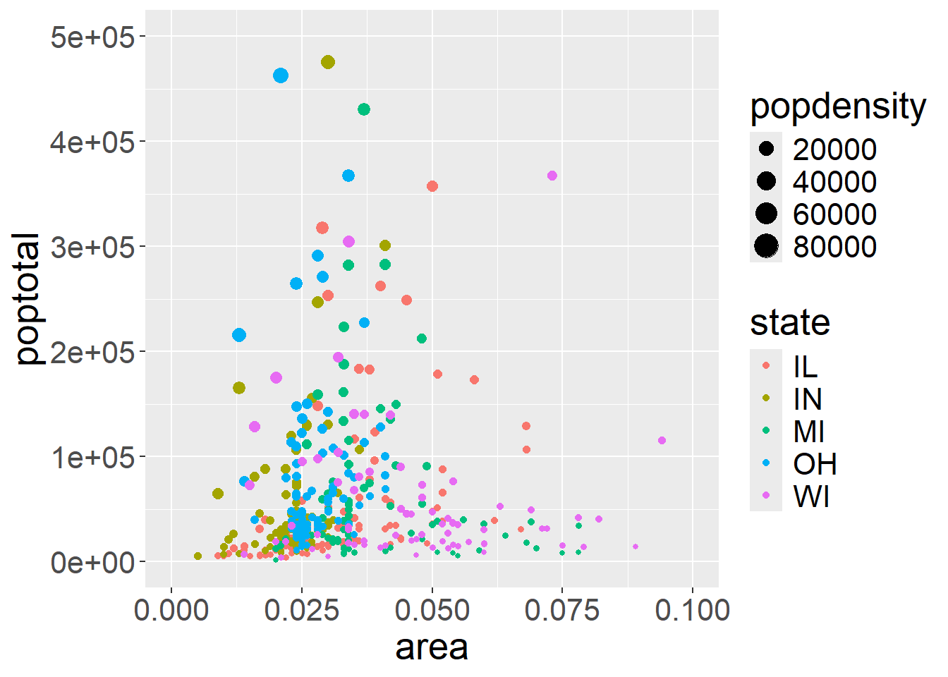 geom_point(aes(col=state, size=popdensity)) + # draw points