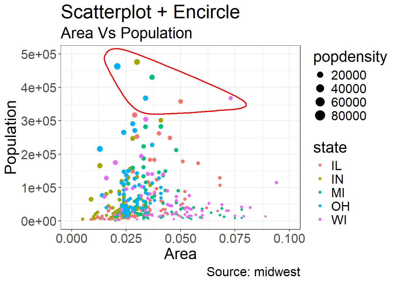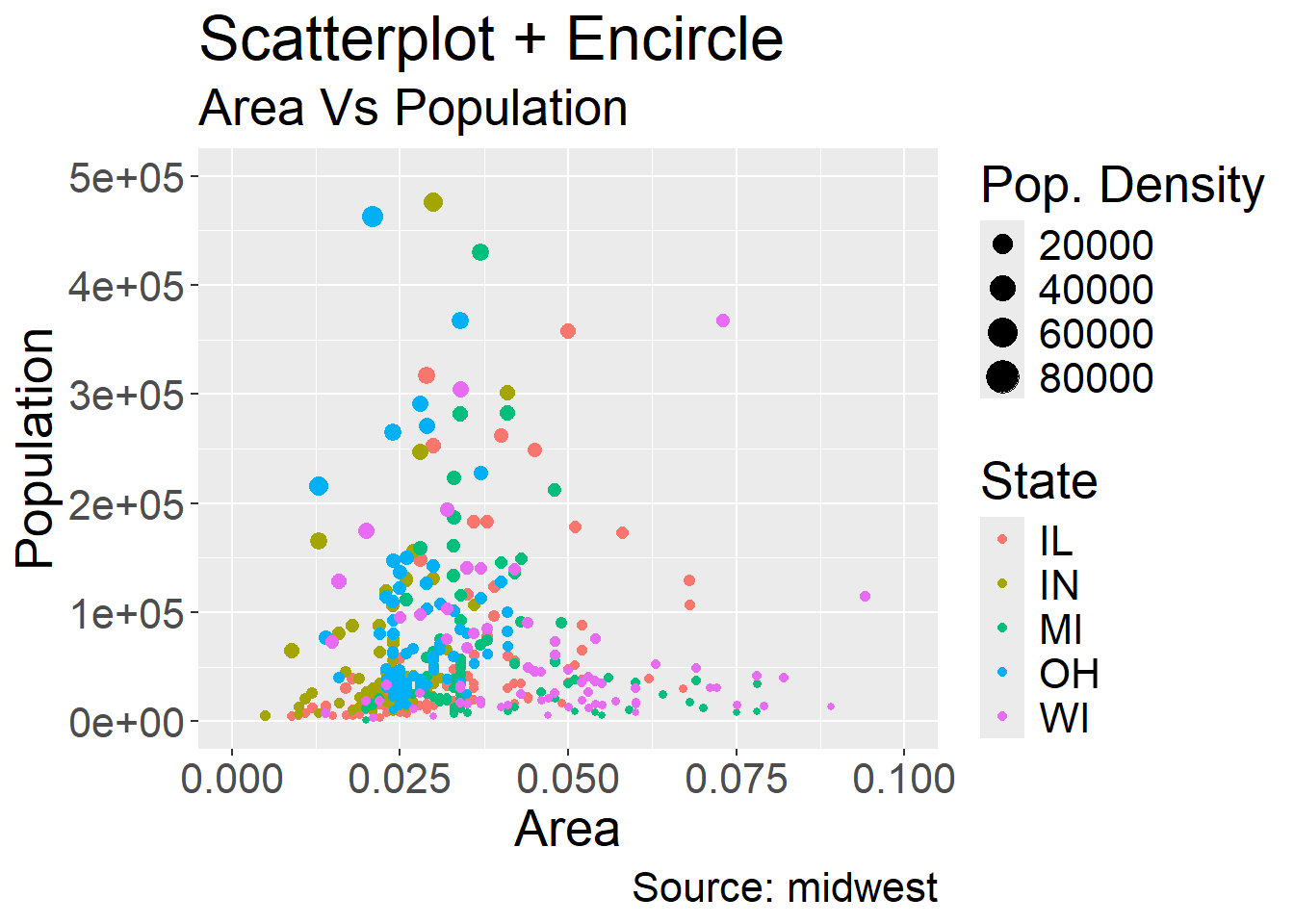 We start with a plain ggplot. Dataset midwest (also from ggplot2 package) contains demographic information of midwest counties (such as total population, area, state, population density, etc) in the USA.