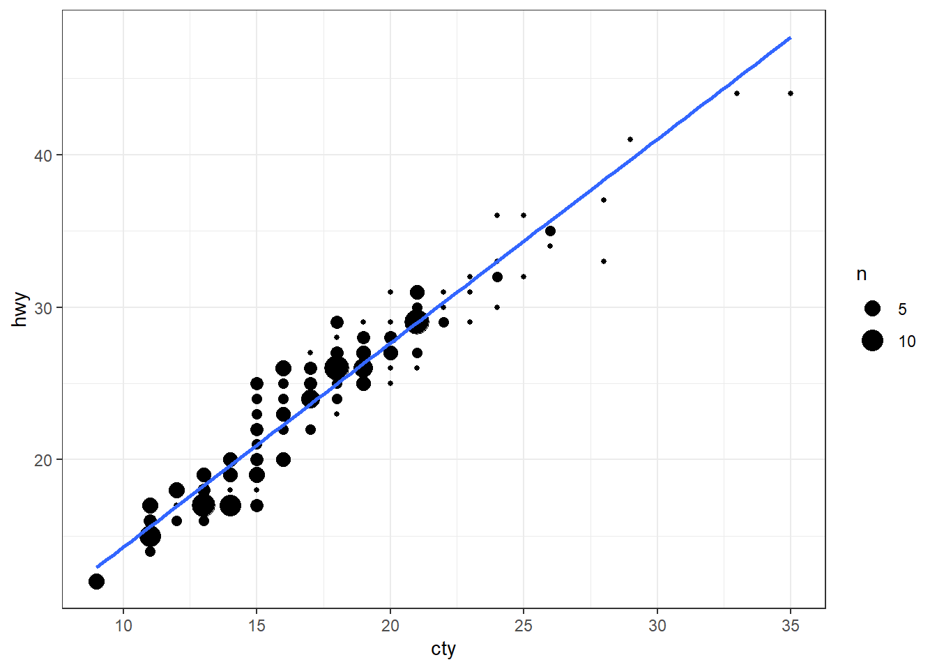 We start from a standard scatter plot of variable hwy vs cty (highway and city ‘miles per gallon’, for various car models) from data set mpg (included in the ggplot2 package).