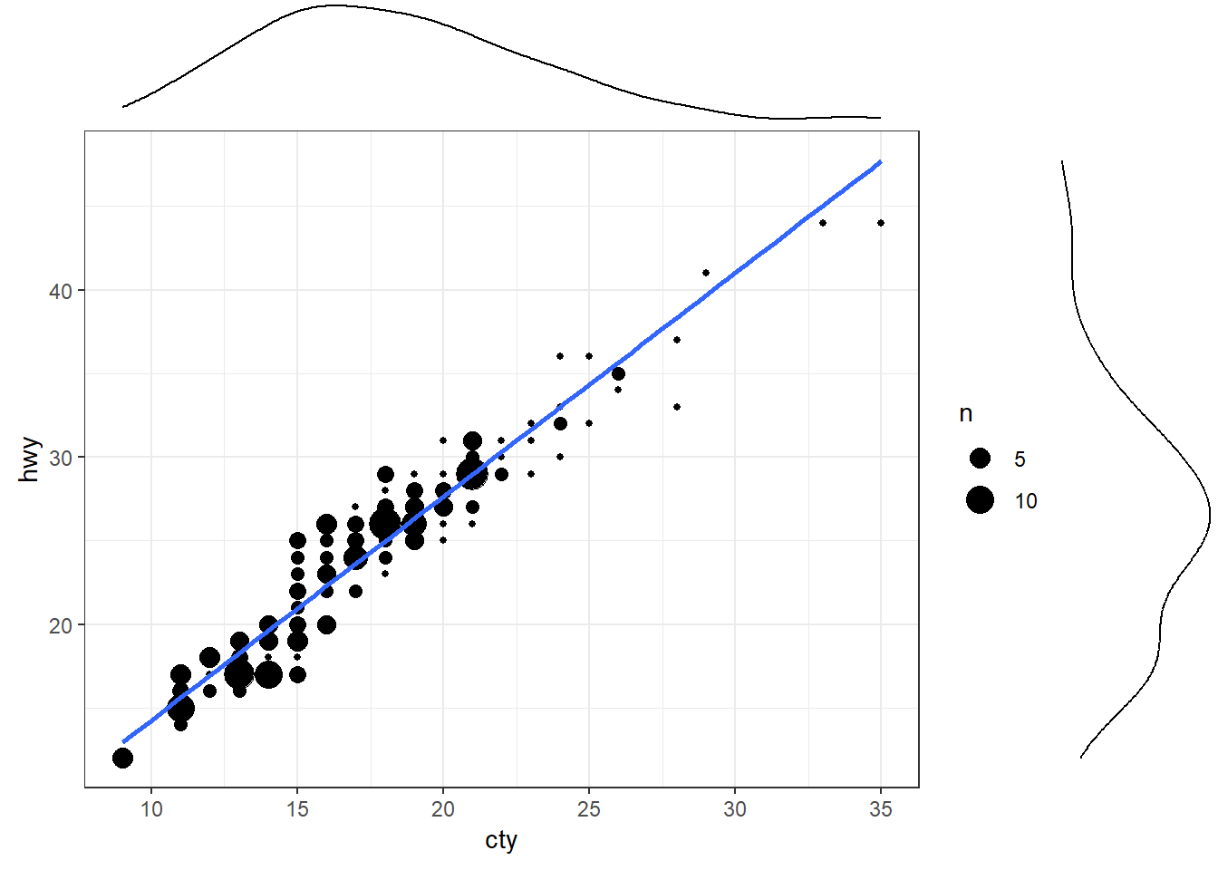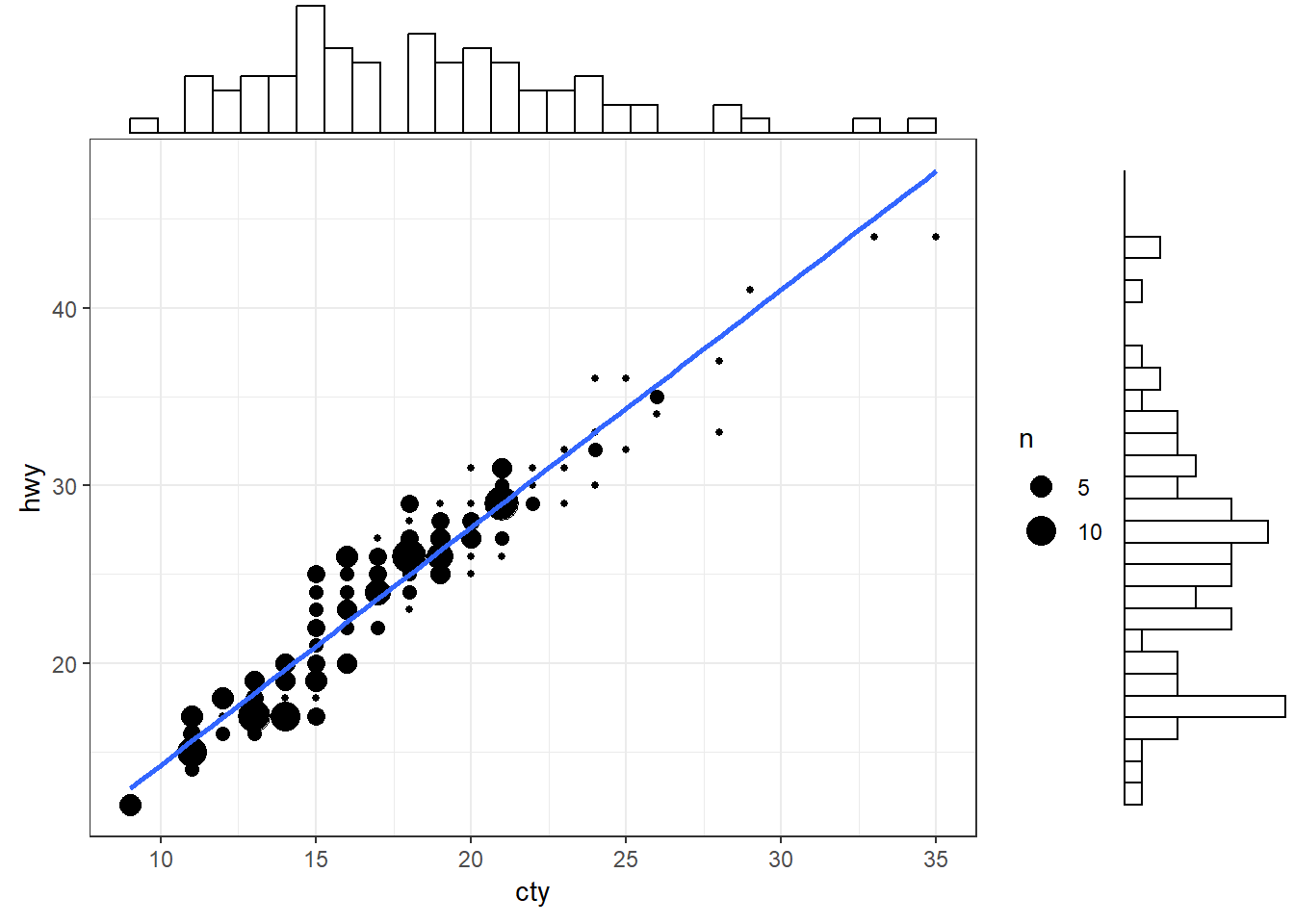 ggMarginal() function from the ggExtra package allows to visualise marginal distributions on top of a scatter plot. Below we add a histogram of marginal distributions on top of the scatter plot.g <- ggplot(mpg, aes(cty, hwy)) +