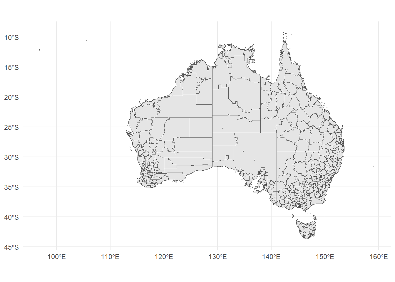 LGA11aAust.shpLGA11aAust.cpgLGA11aAust.dbfLGA11aAust.shxLGA11aAust.prjOnce geometry data is found, we can use geom_sf (sf for shapefile) to create a map image: