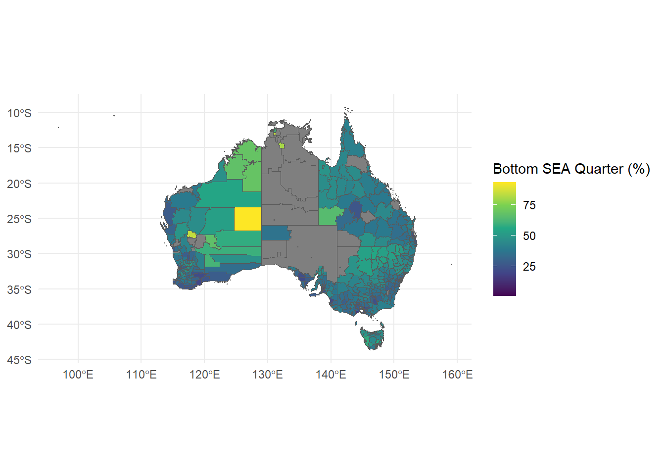 To make this graph informative, we then need some numerical data which is also grouped by LGA to plot on this map. heatmap_data.csv contains data on Index of Community Socio-Educational Advantage (ICSEA) by each LGA, so we need to merge this data with our shapefile data.