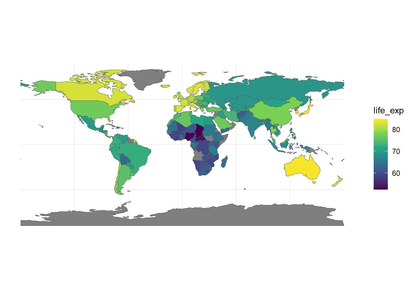 tmap which is more specifically designed for this task and comes with some nice default features.tidyverse.Use the world.gpkg data set to generate a map of the world using life expectancy as the scale. .gpkg files are another way of storing shapefile data other than the 5 file method you saw before but you can read it the same way using st_read(world.gpkg).
