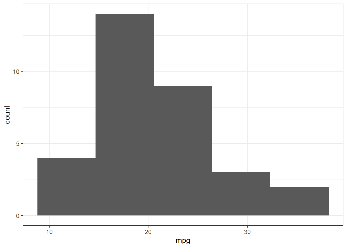 ggplot(mtcars, aes(mpg))+geom_histogram(bins=5) # histogram