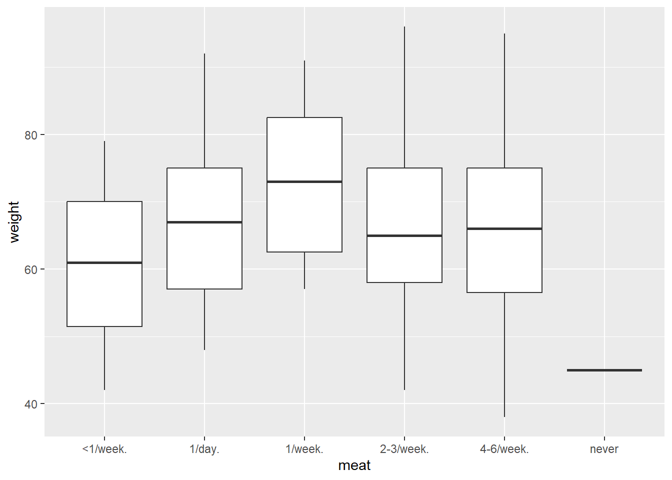 ggplot(raw_data)+geom_boxplot(aes(meat,weight))