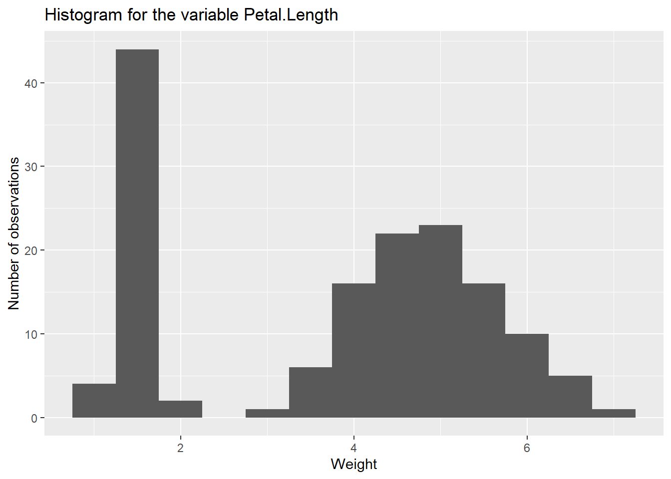 se=TRUE displays the confidence interval on the fitted line (stay tuned for the maths of this in ACTL2131, a second year course)ggplot. In this case, raw_data and aes(height, weight) were inherited by both geom_point and geom_smooth, and in fact any other further geoms would also inherit them. This significantly reduces repetition when it is appropriate.labs is used to customise any fixed label, i.e. x and y axes, the main title, legend titles, etc.Use the iris dataset. Create a histogram for the variable Petal.Length. Add appropriate labels (x-axis, y-axis) and a title to the plot.