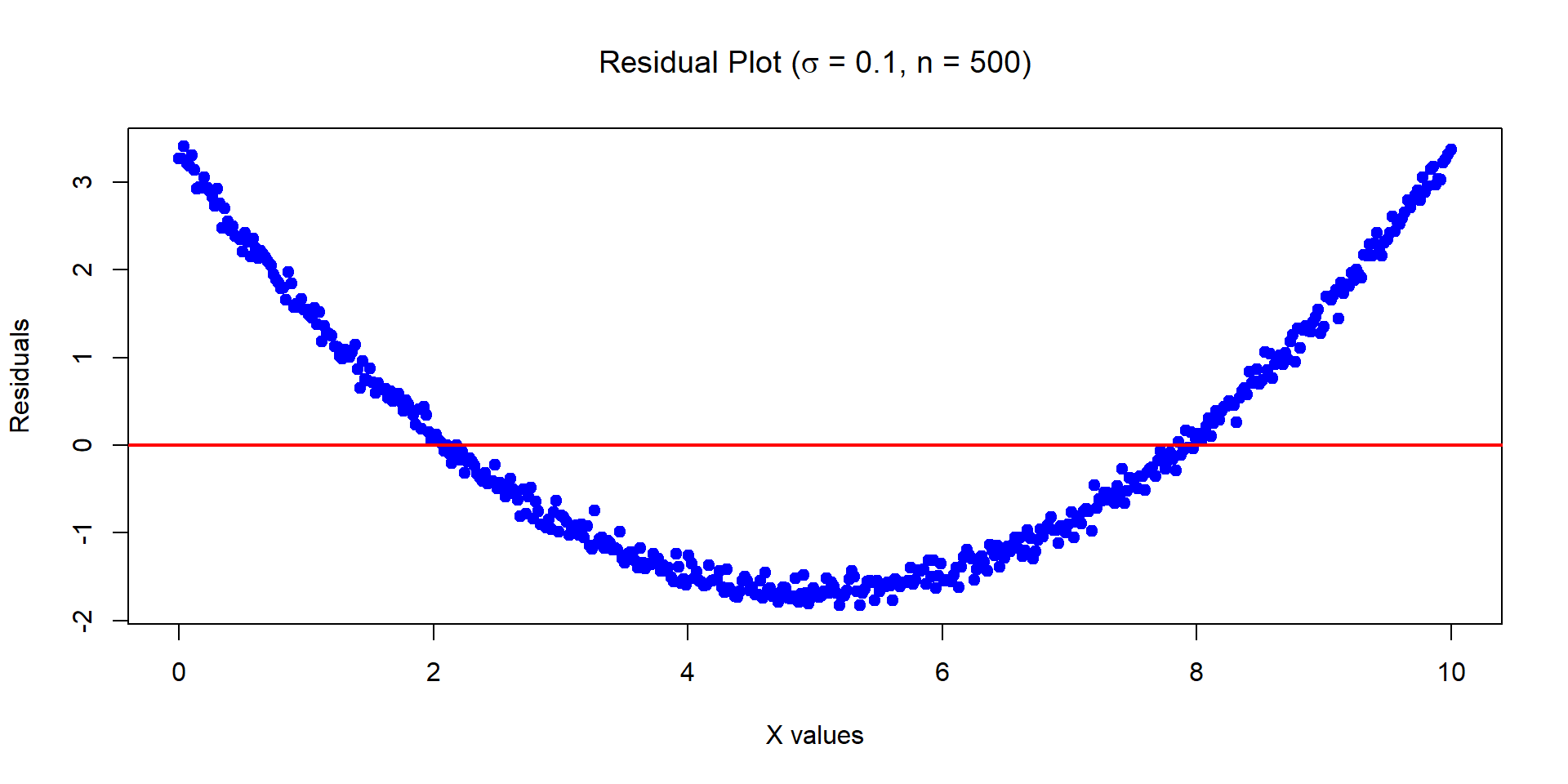The below data was generated by Y = 1 + 0.2 \times X^2 + \epsilon where X \sim U[0,10] and \epsilon \sim N(0, \sigma^2=0.01) with n = 500.