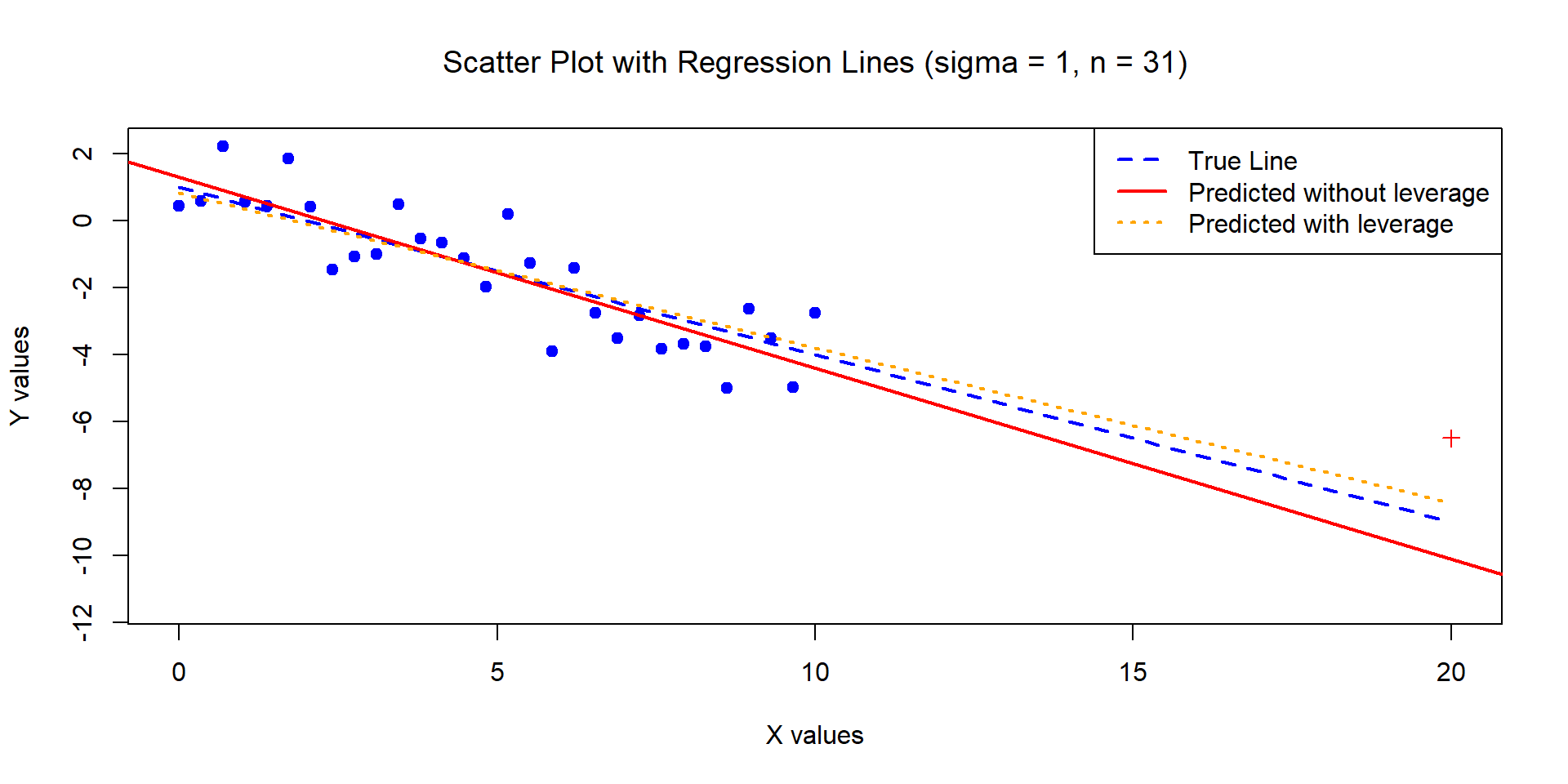 The below data was generated by Y = 1 - 0.5\times X + \epsilon where X \sim U[0,10] and \epsilon \sim N(0,1) with n = 30. We have added one high leverage point (made a red ‘+’ on the scatterplot).