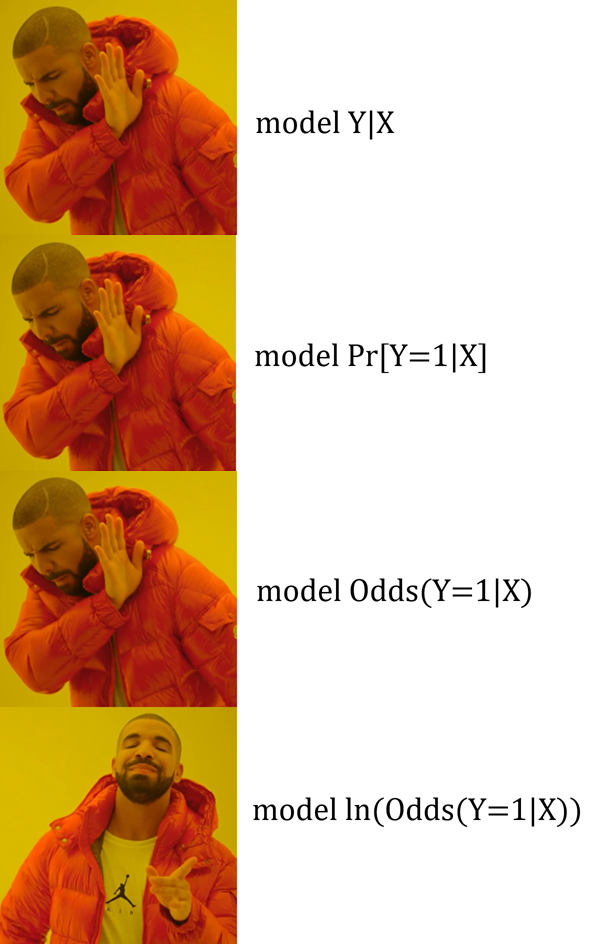- Question for a Champion: why not simply model the probability \mathbb{P}[Y=1|\mathrm{X}] as function of predictor(s) \mathrm{X}?