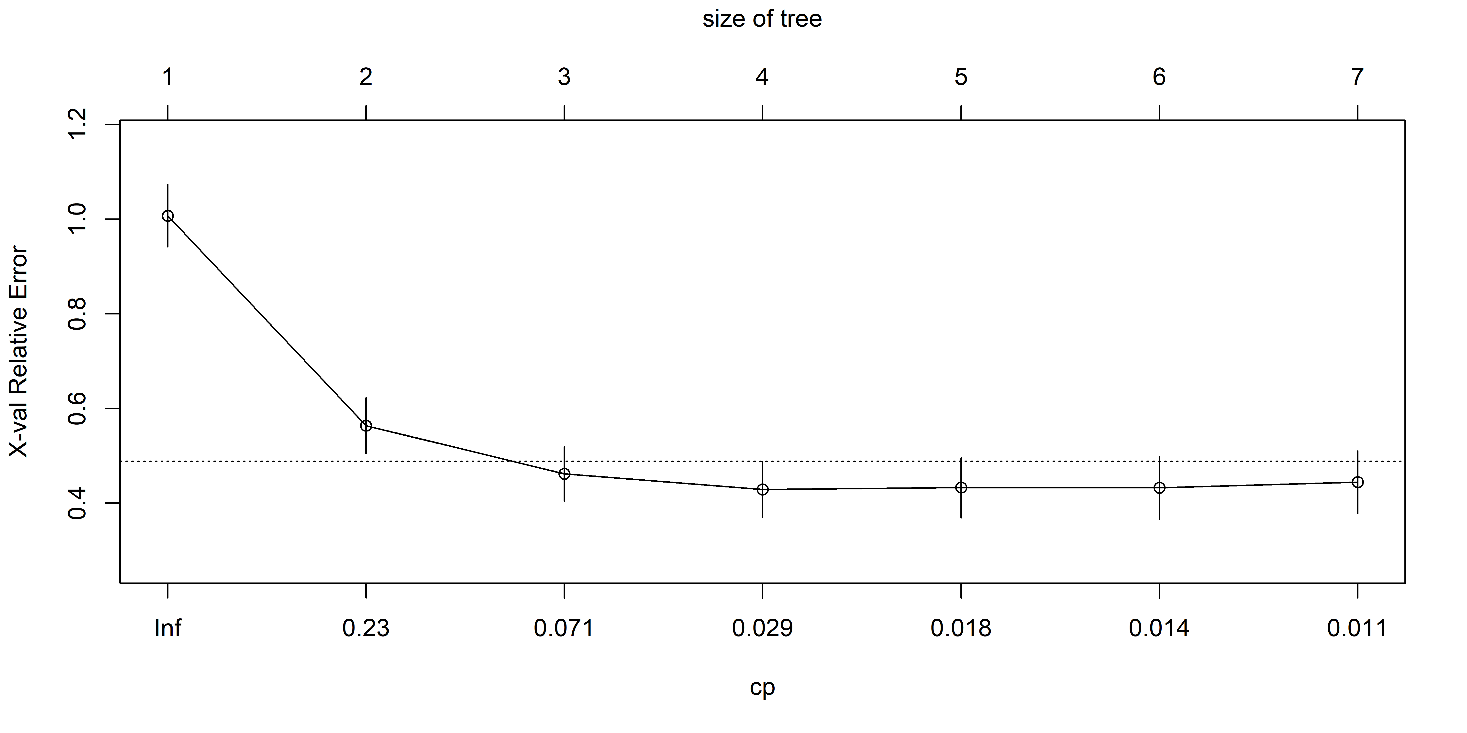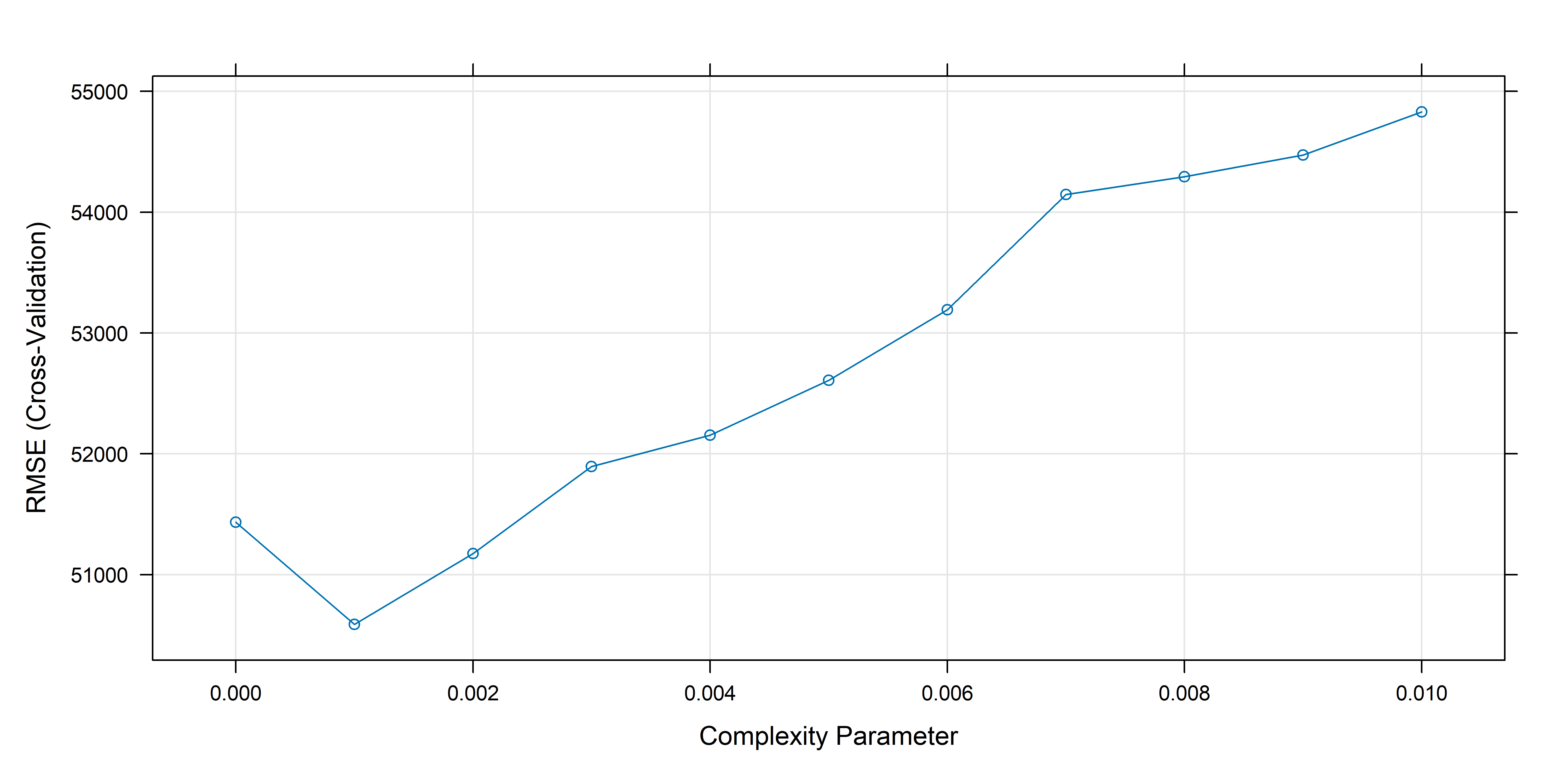 # Perform cross-validation to prune the treeset.seed(123)cv_tree <-train( amountPaidOnBuildingClaim ~ ., data=train_set, method="rpart",trControl=trainControl(method="cv", number=5),tuneGrid=data.frame(cp=seq(0, 0.01, 0.001)))# Get the optimal cp valueoptimal_cp <- cv_tree$bestTune$cpplot(cv_tree)