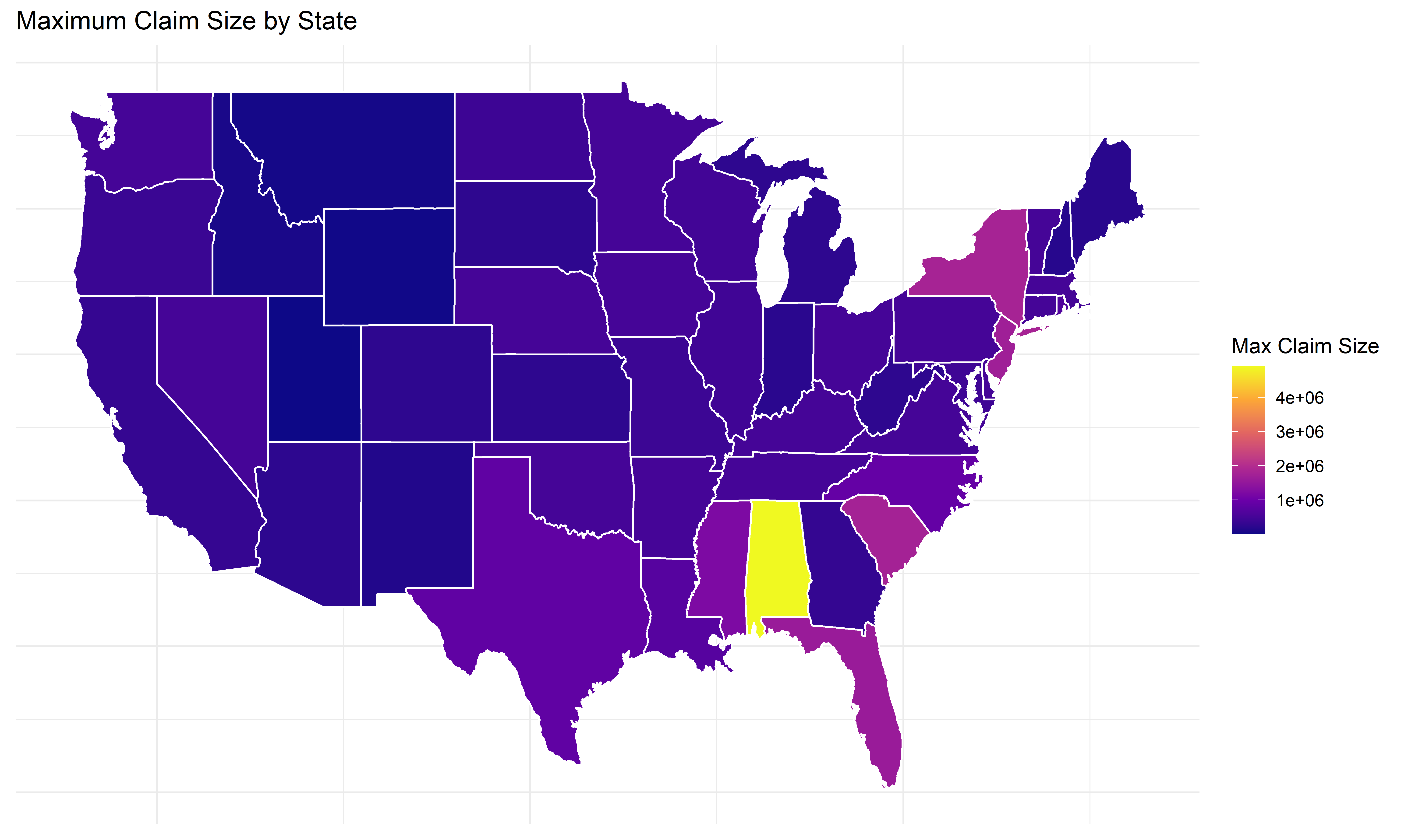 # Plot maximum claim size by stateggplot(states_map, aes(long, lat, group = group, fill = max_claim_size)) +geom_polygon(color ="white") +scale_fill_viridis_c(option ="C") +labs(title ="Maximum Claim Size by State",fill ="Max Claim Size") +theme_minimal() +theme(axis.title =element_blank(), axis.text =element_blank(), axis.ticks =element_blank())