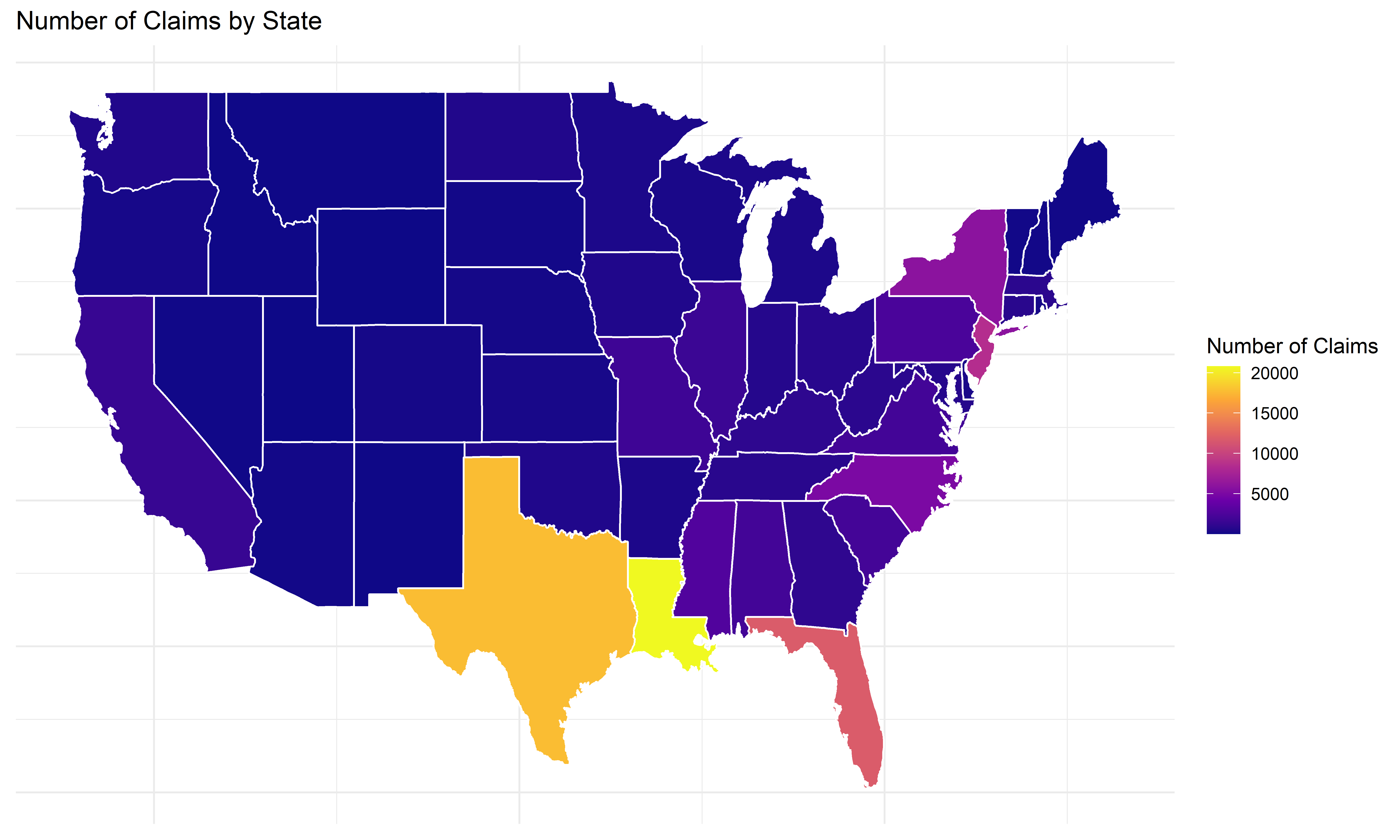 ggplot(states_map, aes(long, lat, group = group, fill = num_claims)) +geom_polygon(color ="white") +scale_fill_viridis_c(option ="C") +labs(title ="Number of Claims by State",fill ="Number of Claims") +theme_minimal() +theme(axis.title =element_blank(), axis.text =element_blank(), axis.ticks =element_blank())