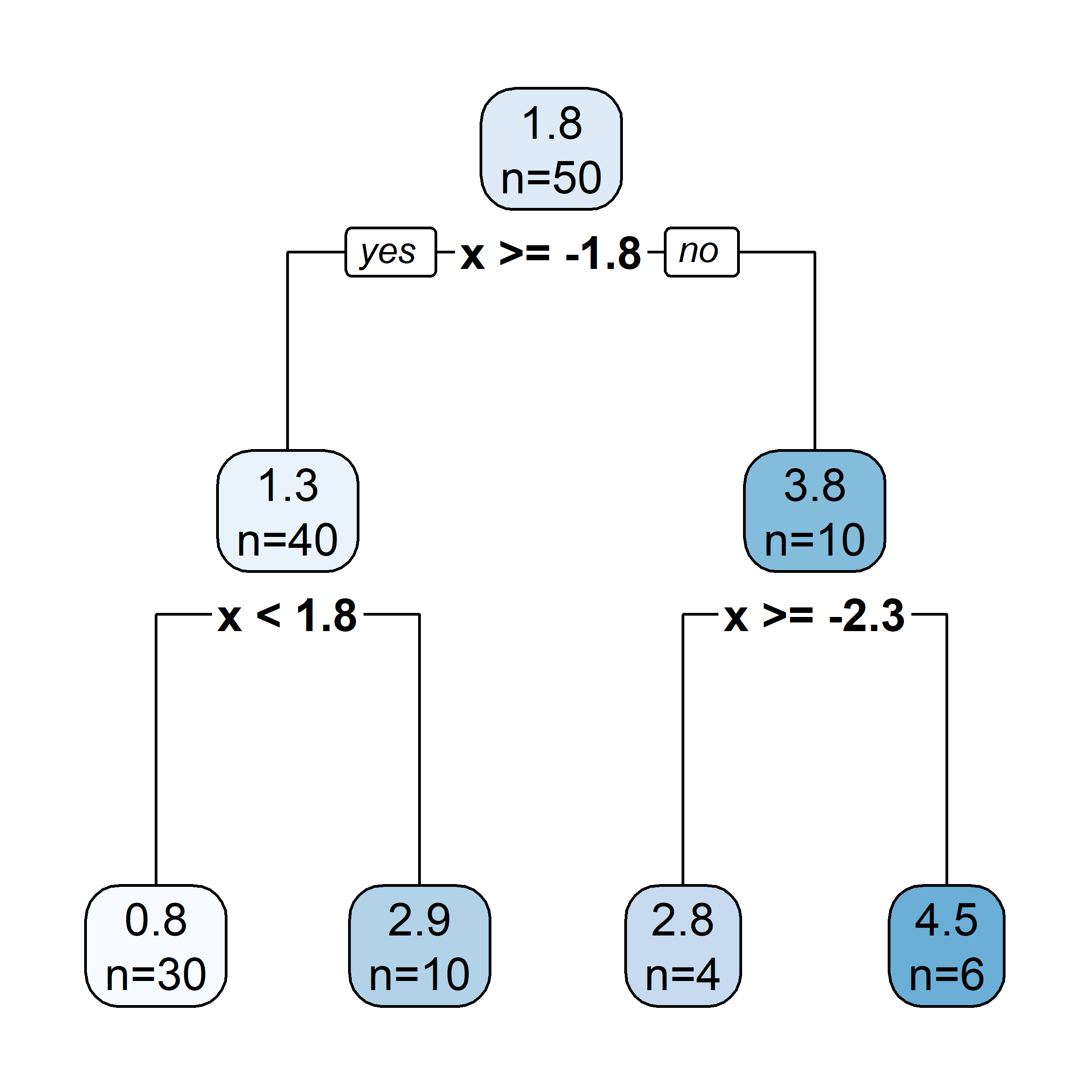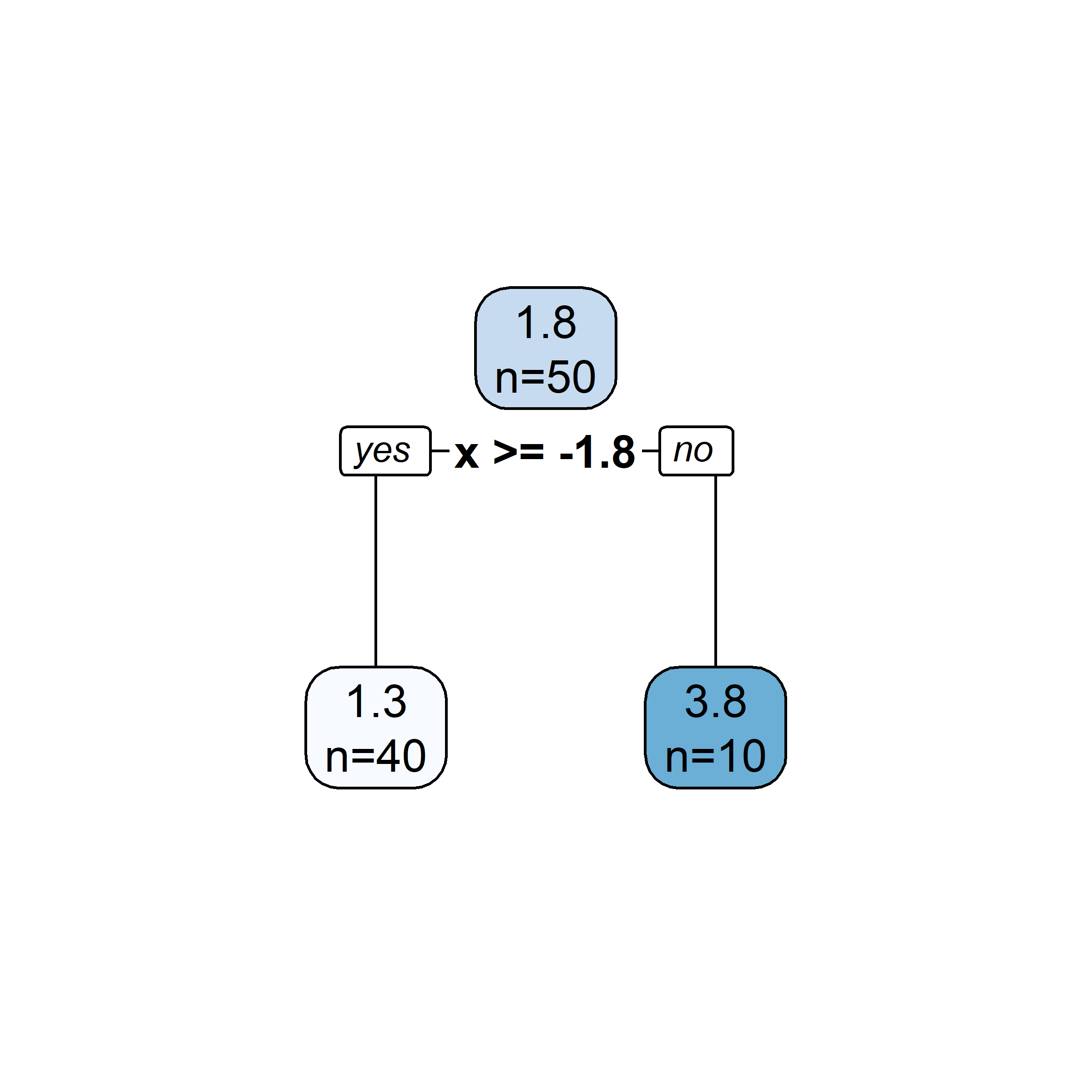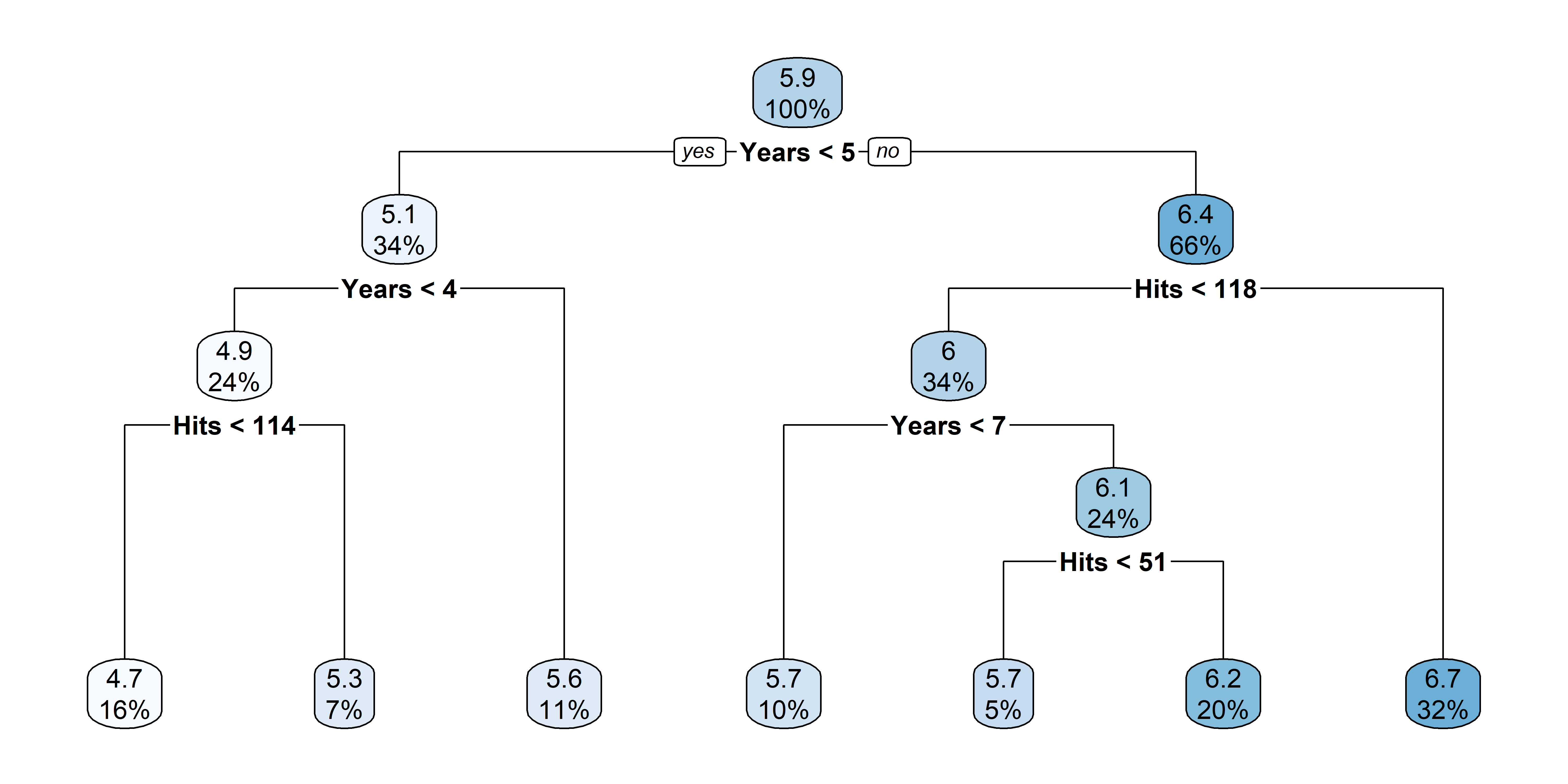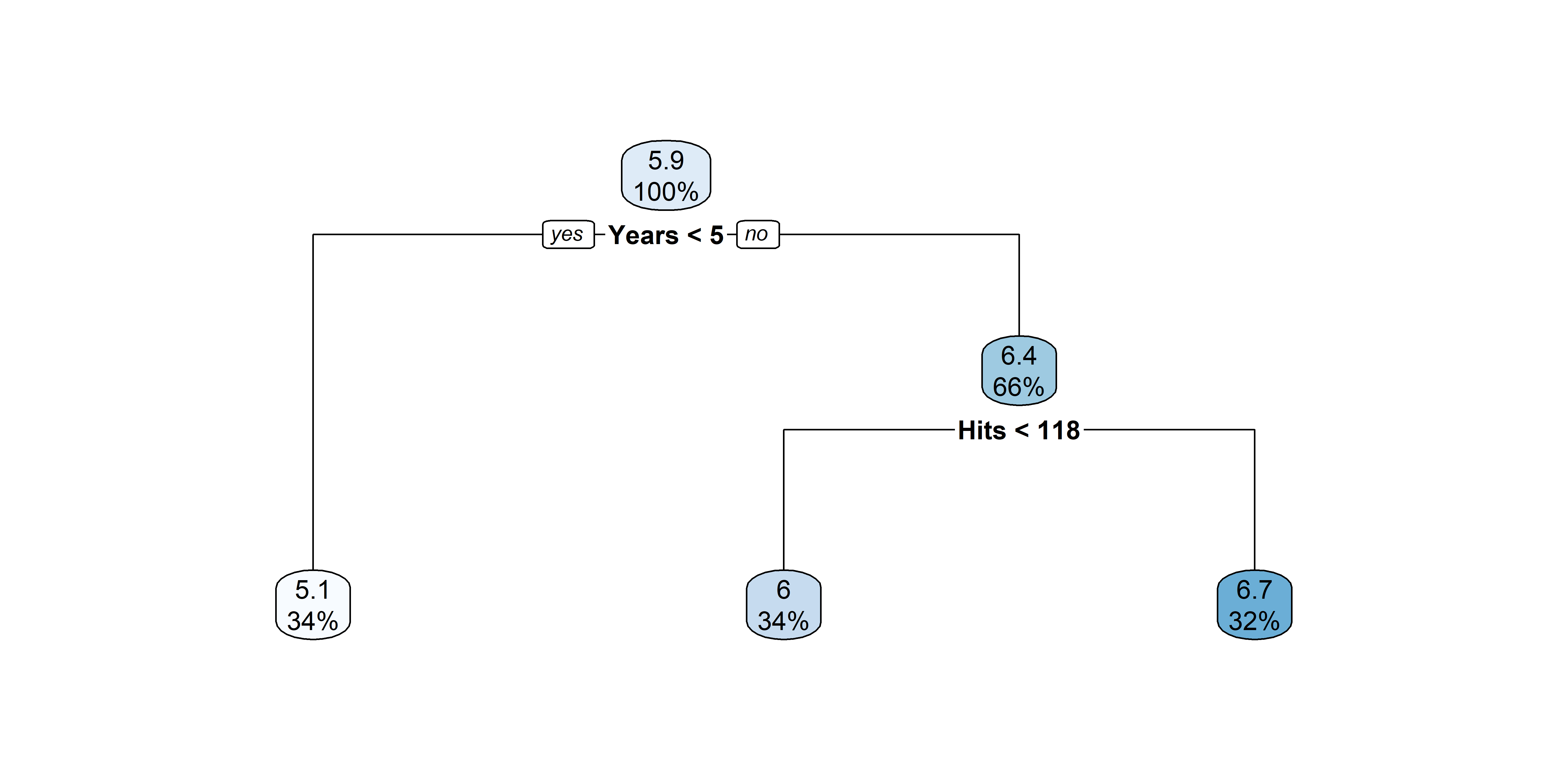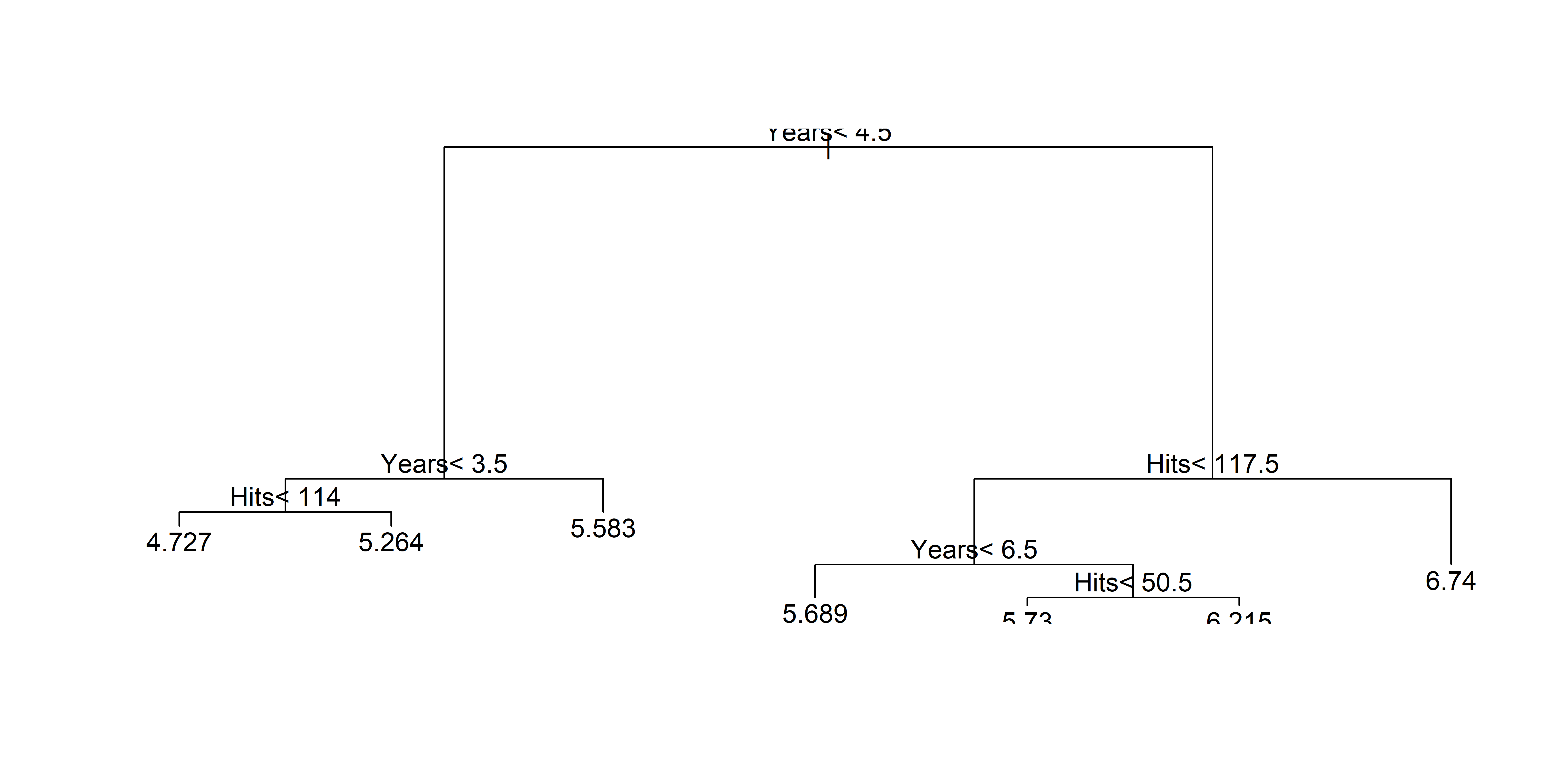 set.seed(123)tree <-rpart(log(Salary) ~ Years + Hits, data = Hitters)tree$cptable