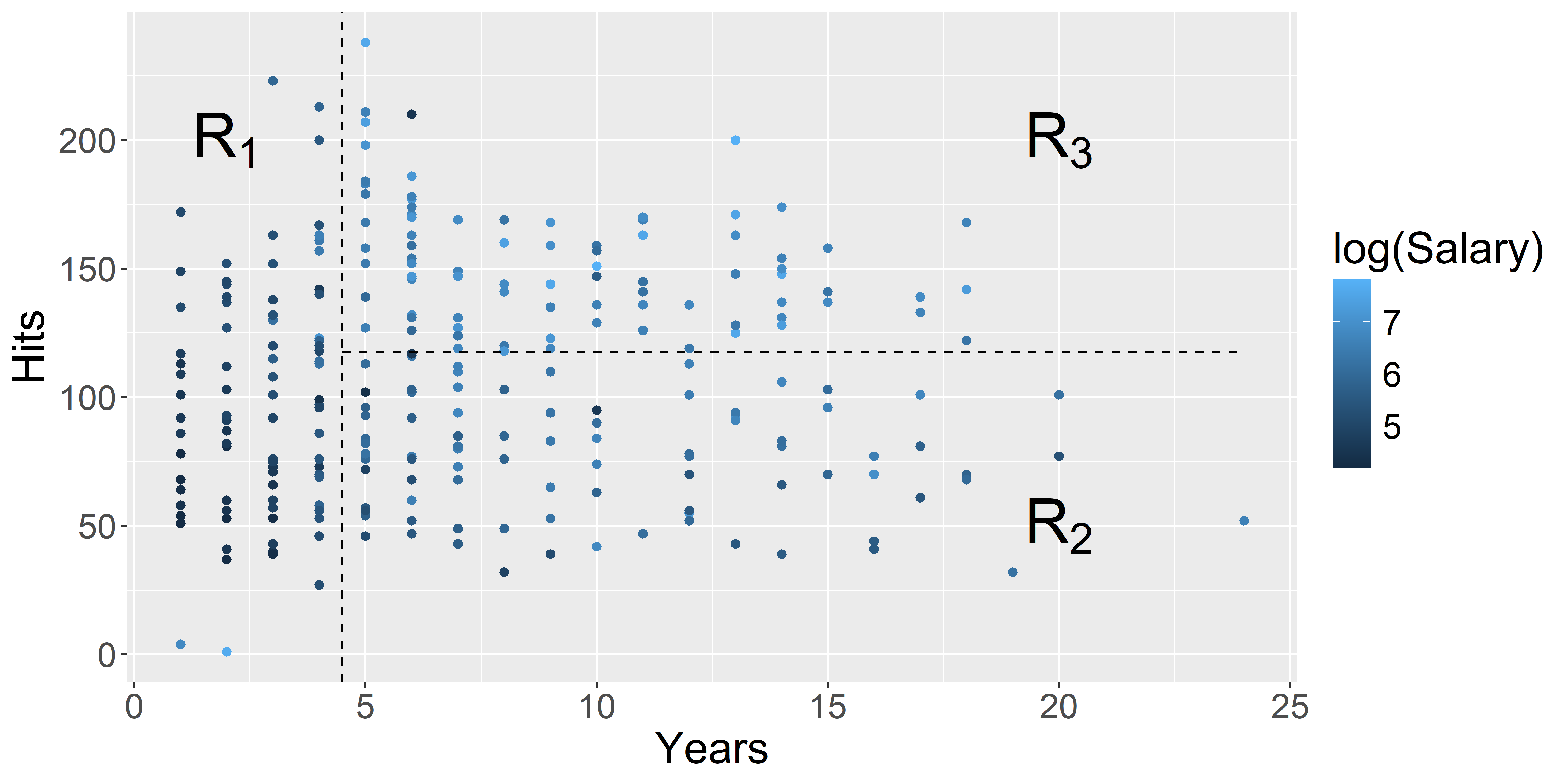 ggplot(Hitters, aes(x = Years, y = Hits, colour =log(Salary))) +geom_point() +geom_vline(xintercept =4.5, colour ="black", linetype ="dashed") +annotate("segment", x =4.5, xend =24, y =117.5, yend =117.5, colour ="black", linetype ="dashed") +annotate("text", x =2, y =200, label ="R[1]", parse =TRUE, size =10) +annotate("text", x =20, y =50, label ="R[2]", parse =TRUE, size =10) +annotate("text", x =20, y =200, label ="R[3]", parse =TRUE, size =10) +theme(text =element_text(size =20))