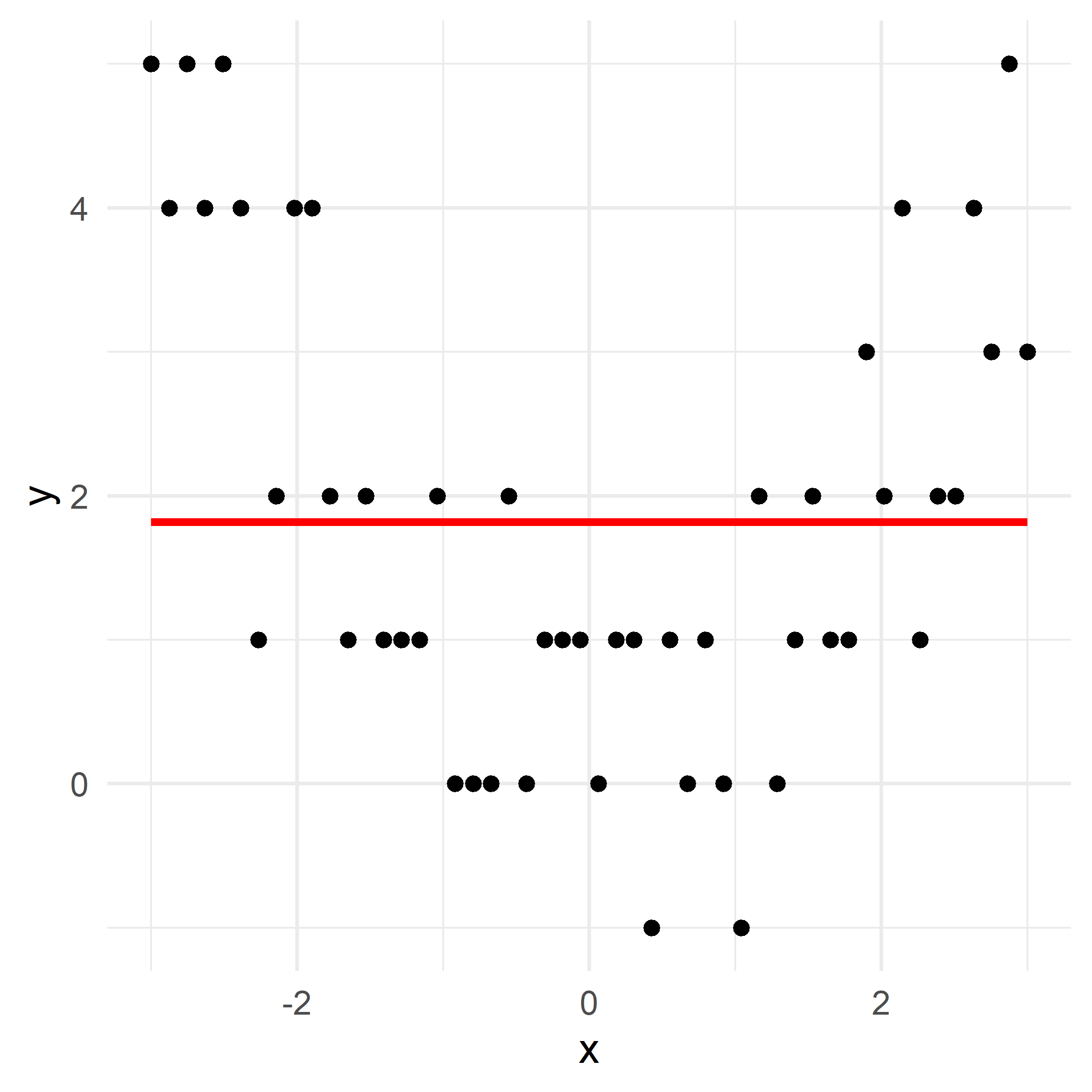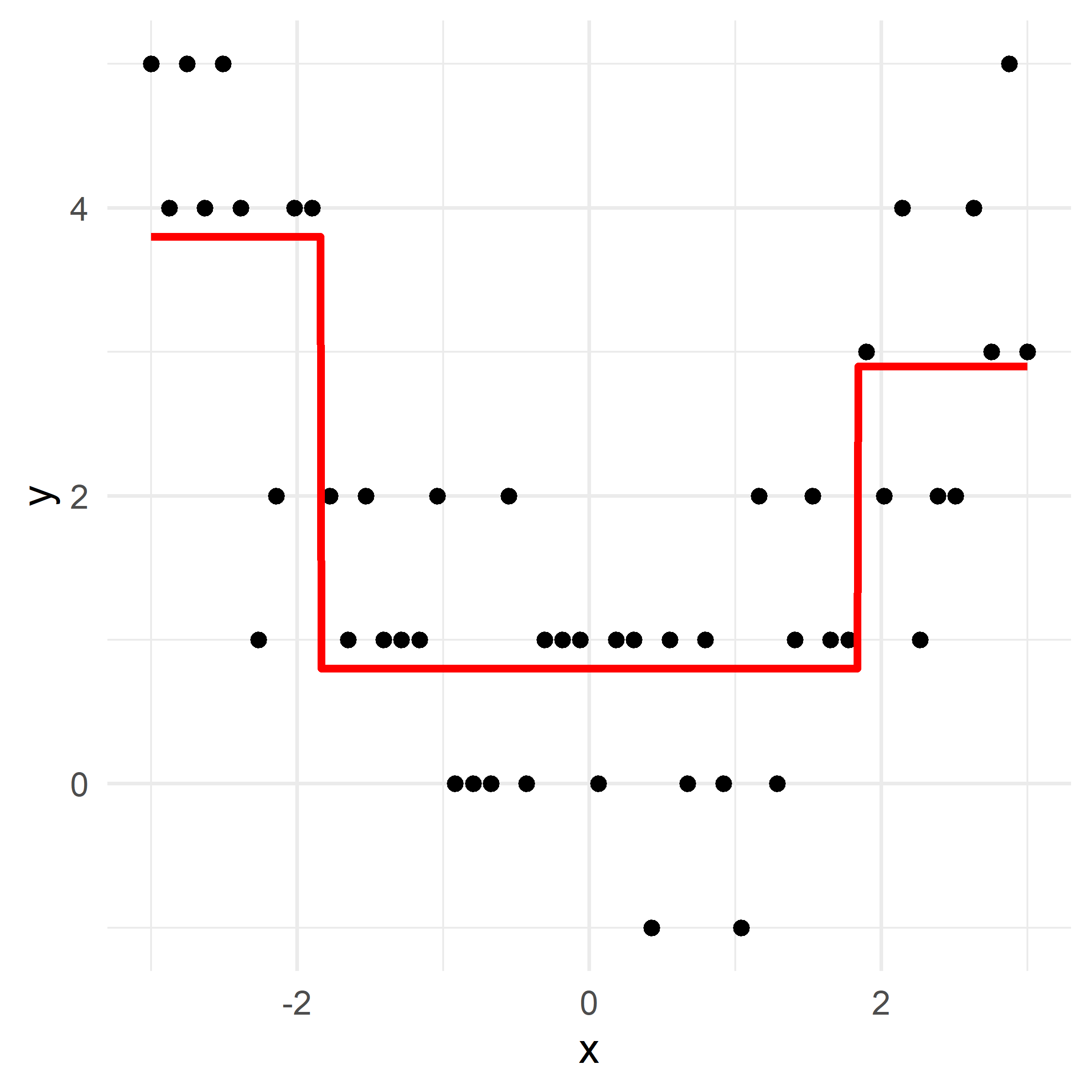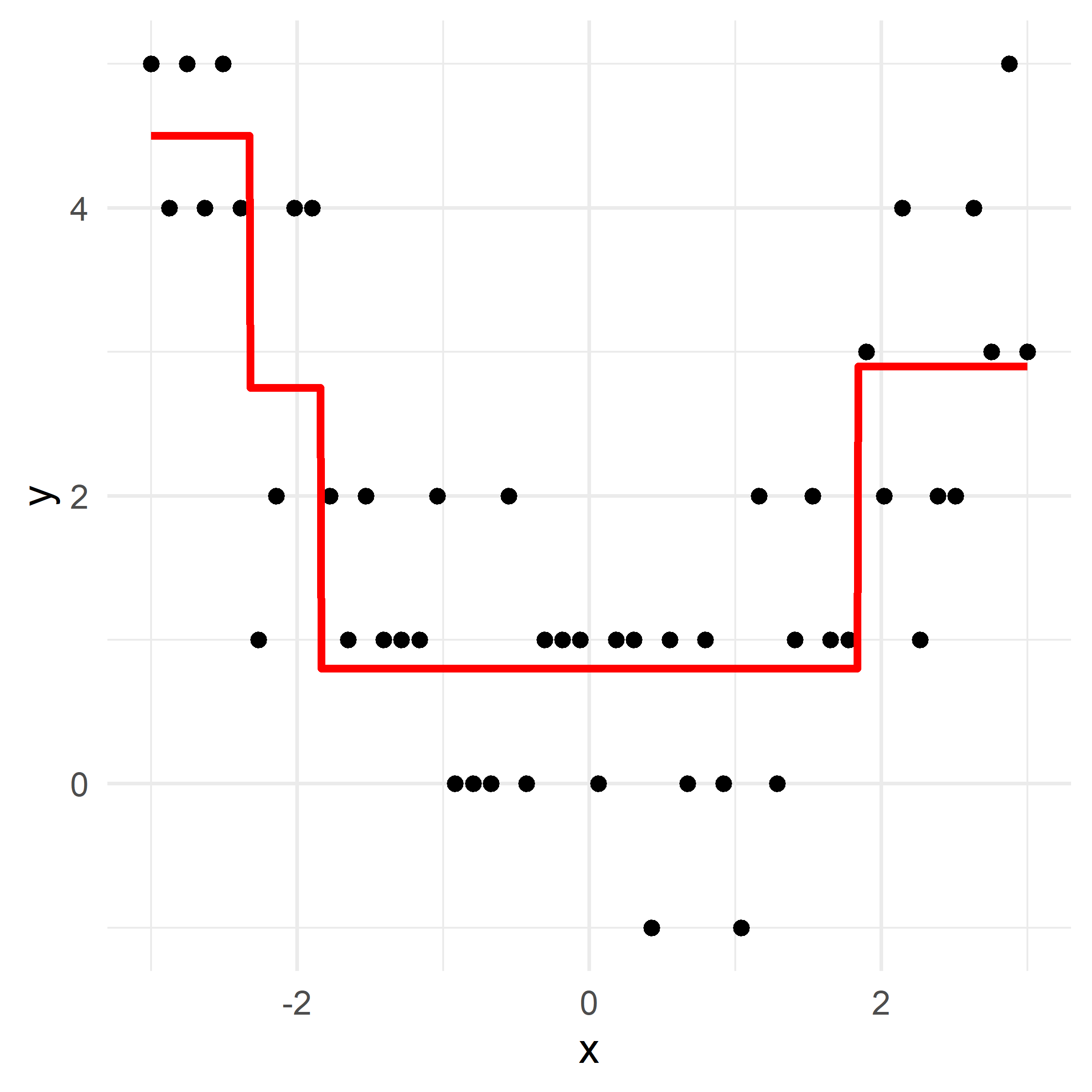 Aggregate: for regression, take the average prediction, at any point x: \hat{f}_\text{bag}(x) = \dfrac{1}{B}\sum_{b=1}^{B} \hat{f}^{\ast b}(x) (same idea for classification, but take a “majority vote”, i.e., for any given x, choose the most common category predicted for that x by the B models)