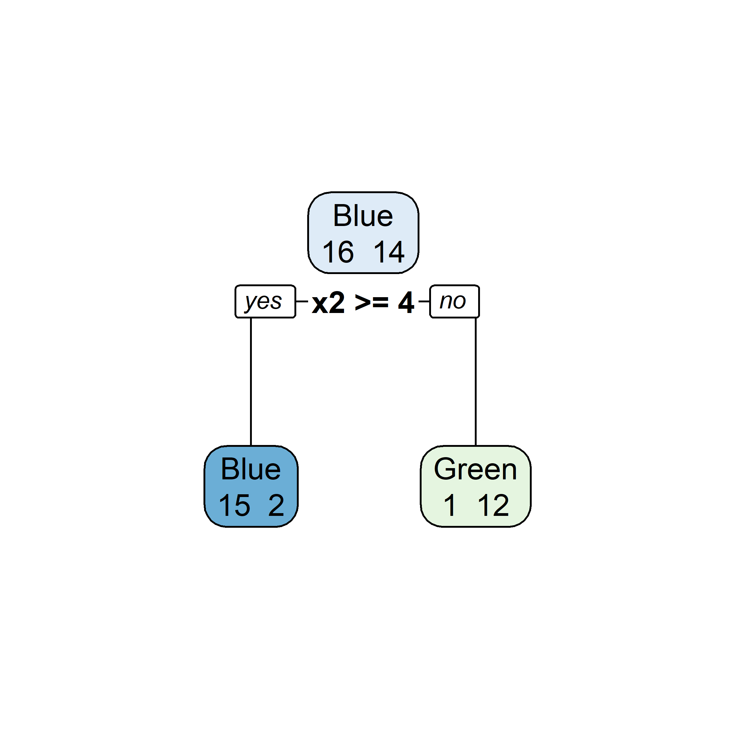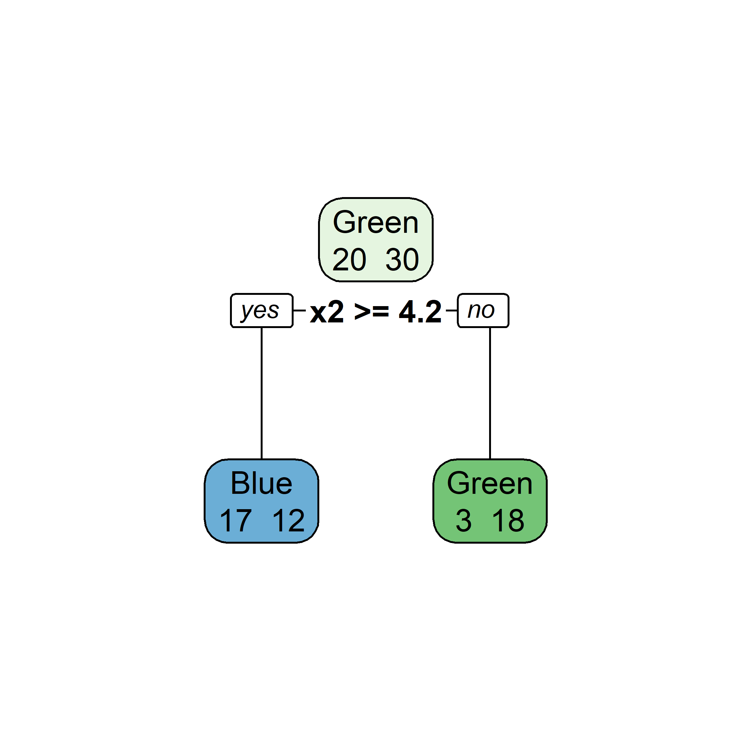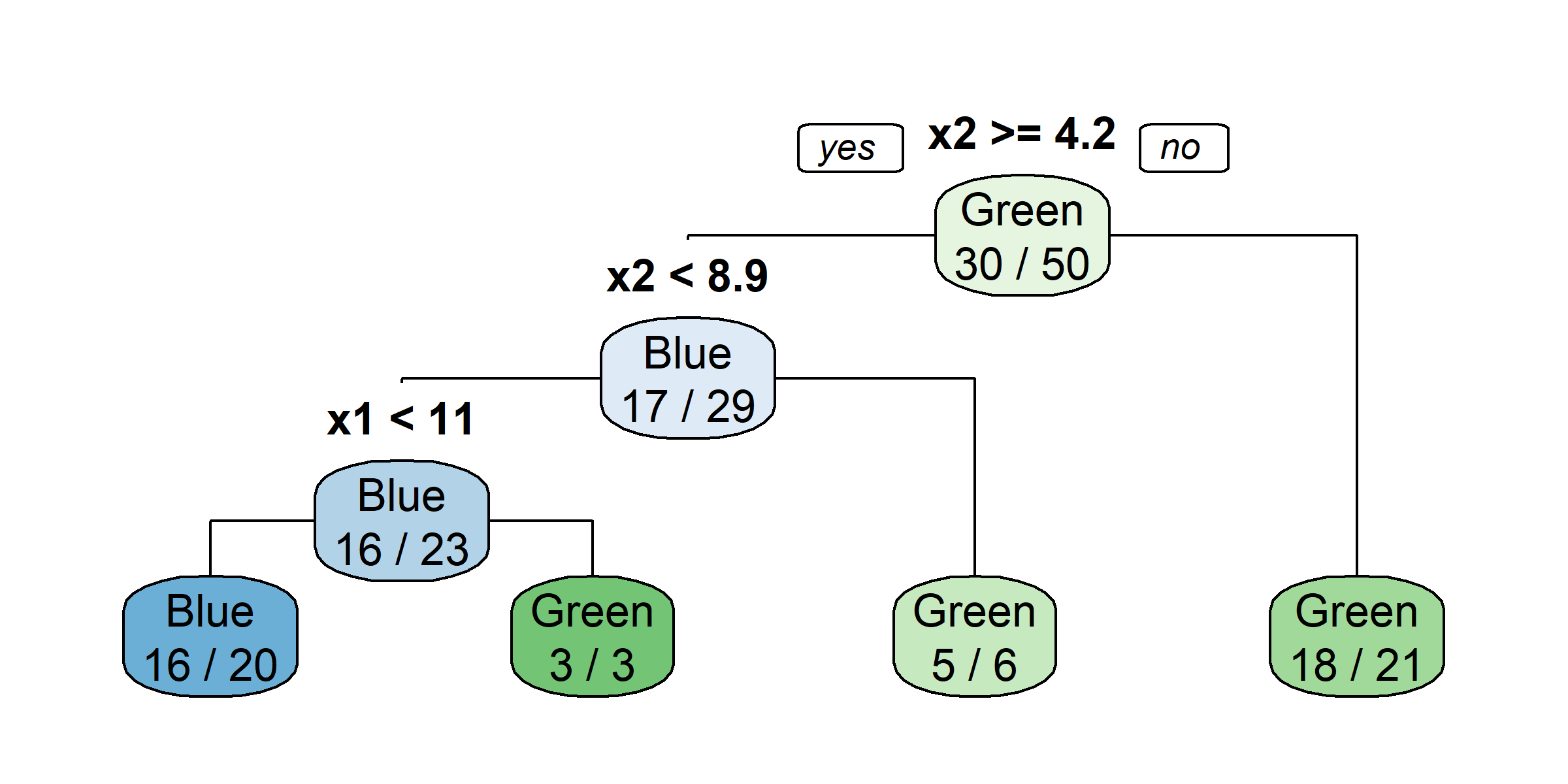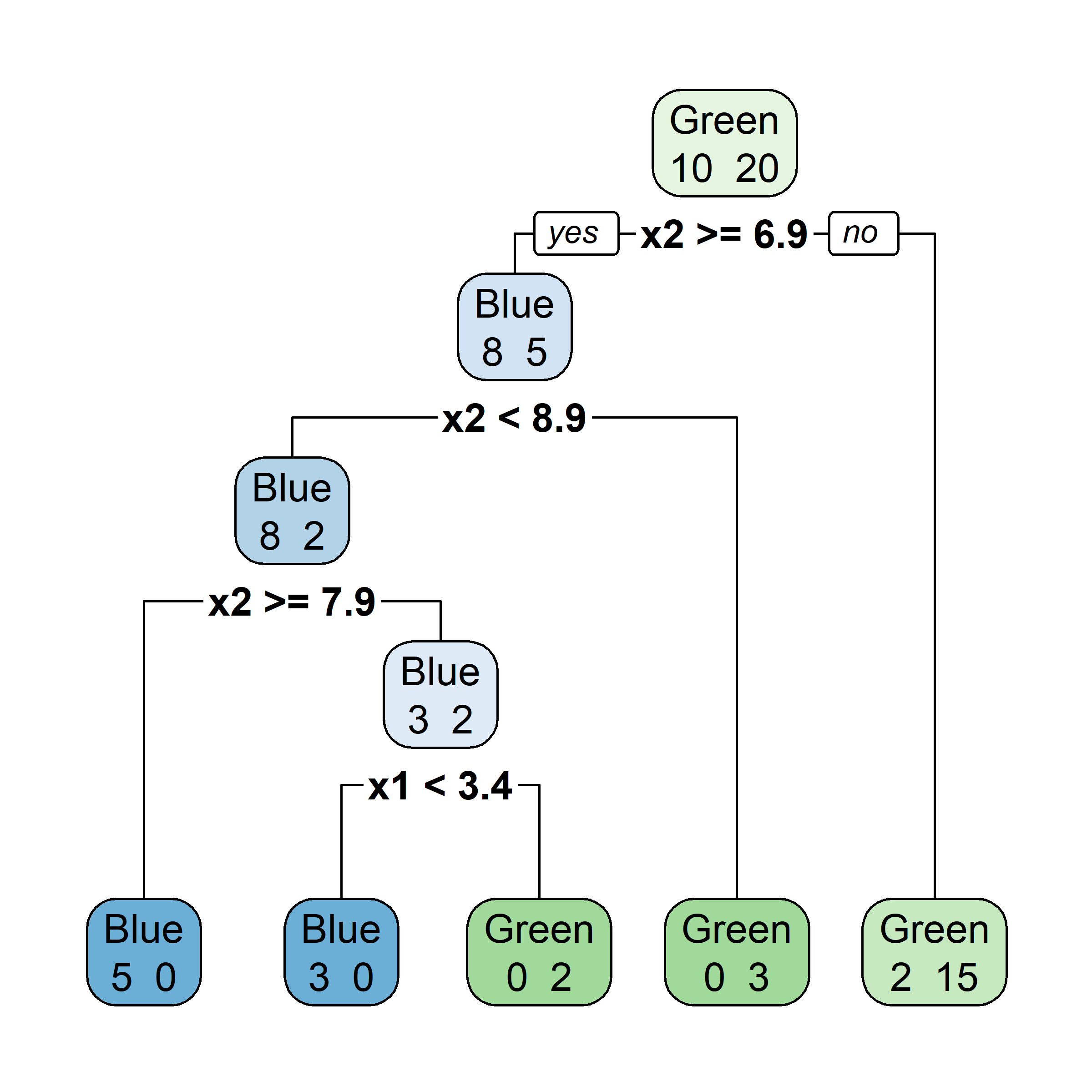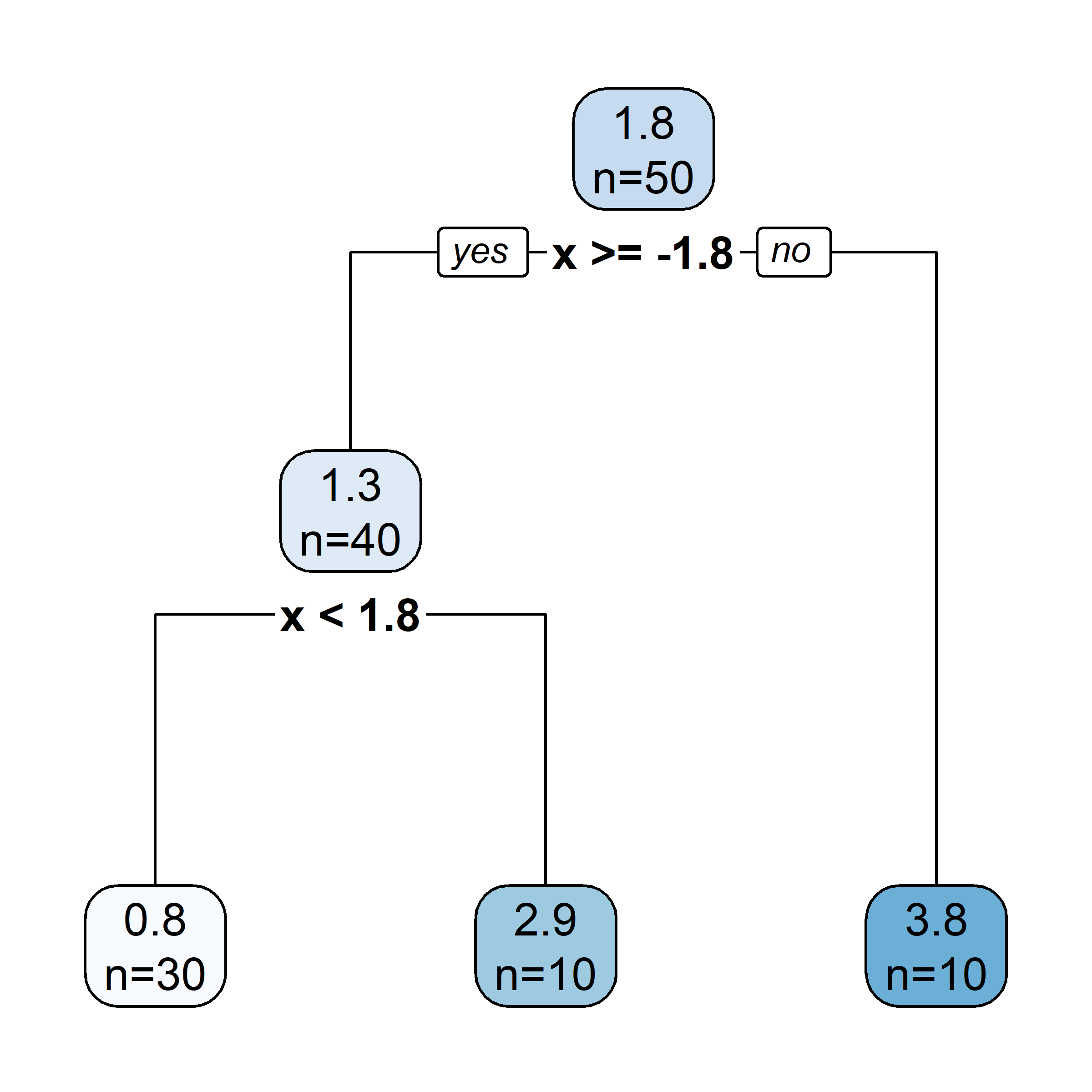 Repeat this splitting process (always turning one leaf into two), until a stopping criterion is reached (e.g., each leaf contains \leq 5 observations).