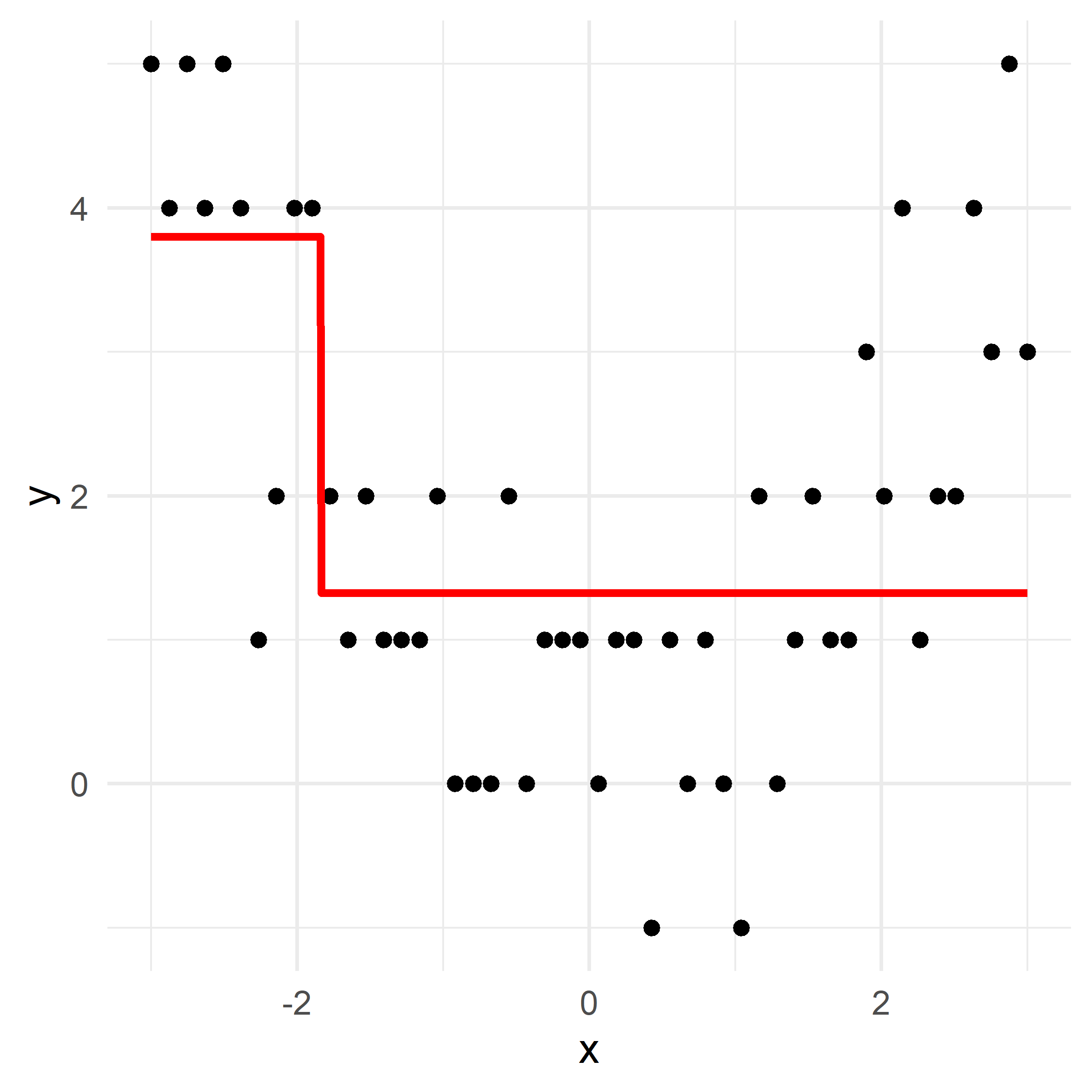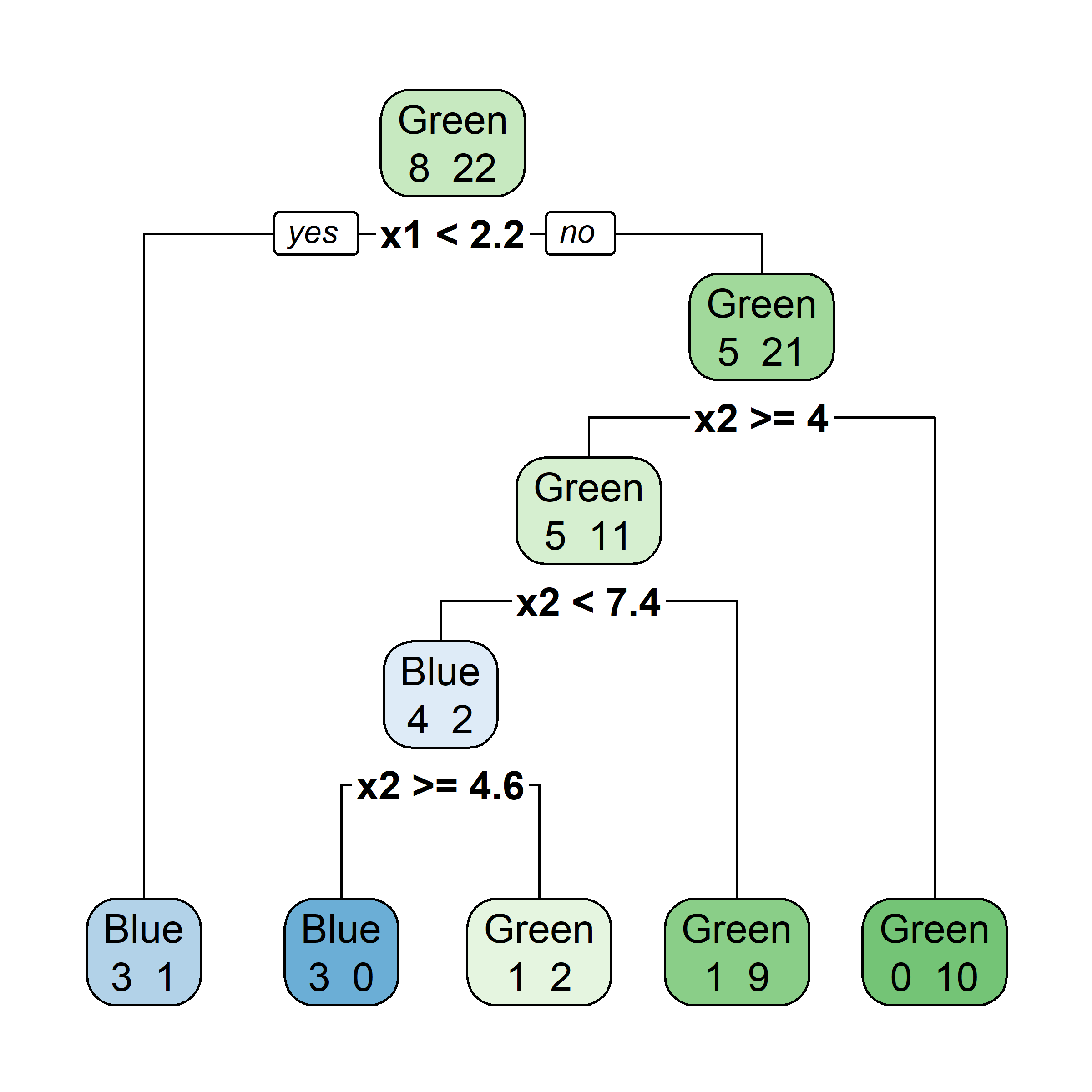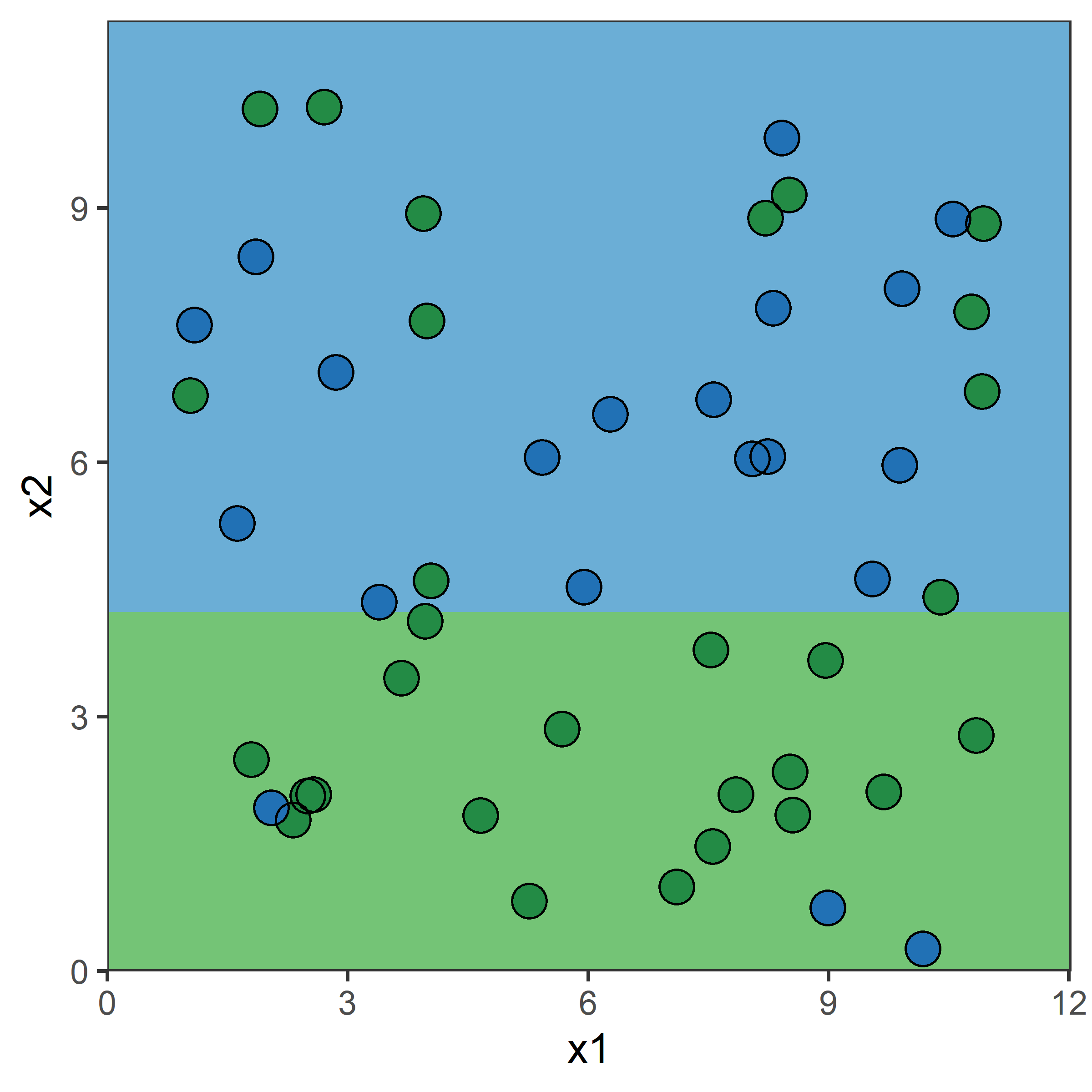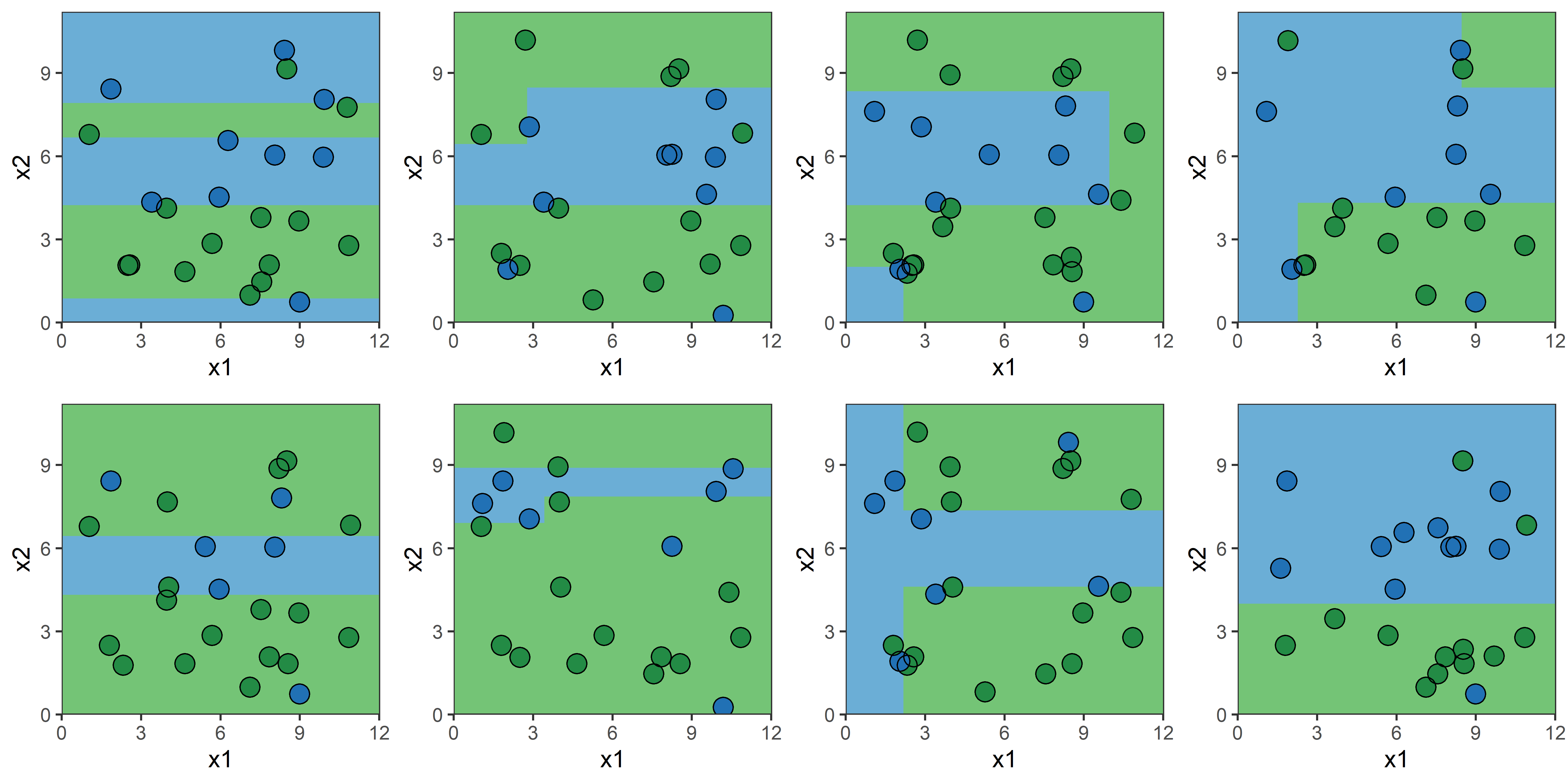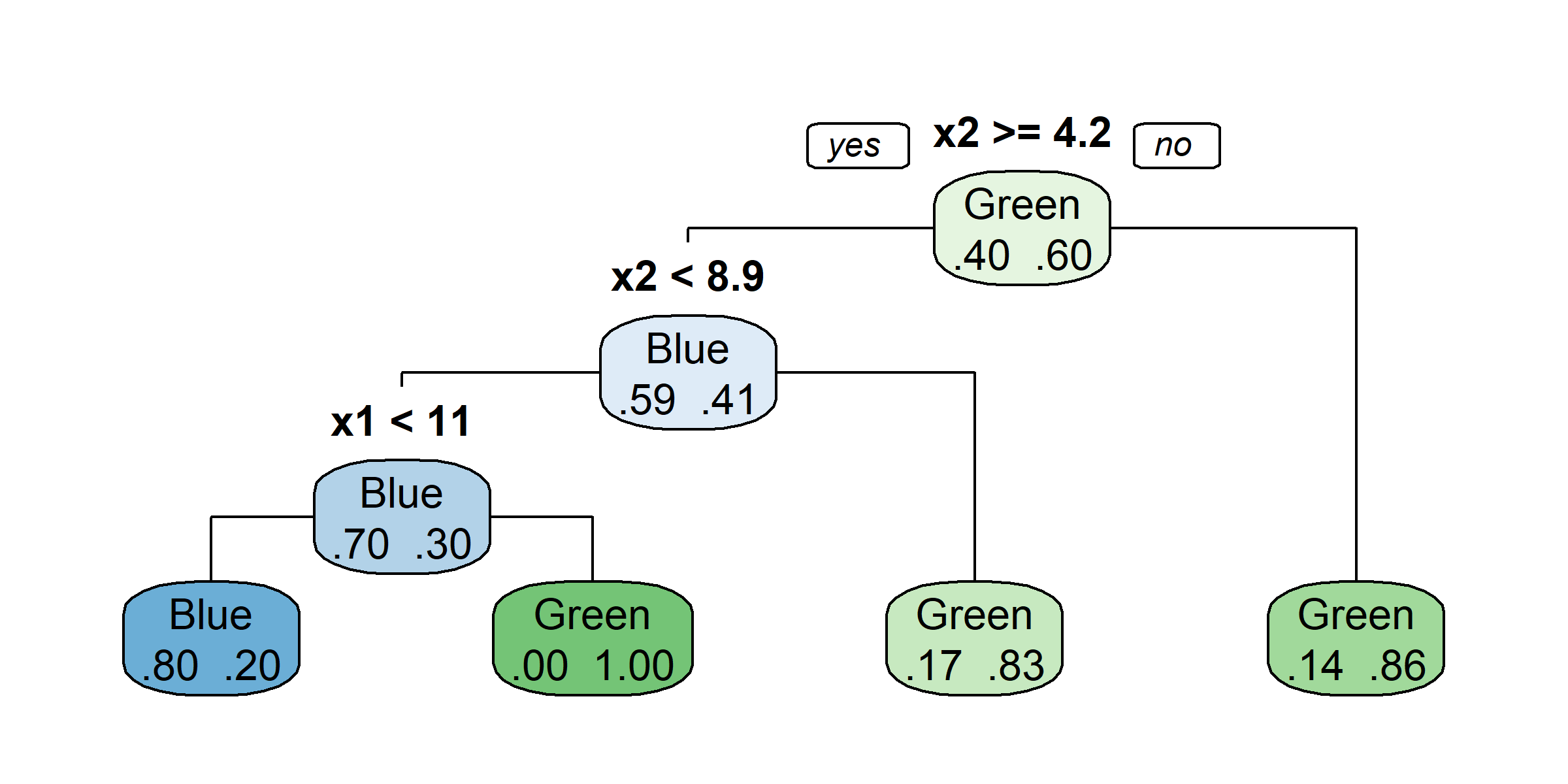 Repeat this splitting process (always turning one leaf into two), until a stopping criterion is reached (e.g., each leaf contains \leq 5 observations).