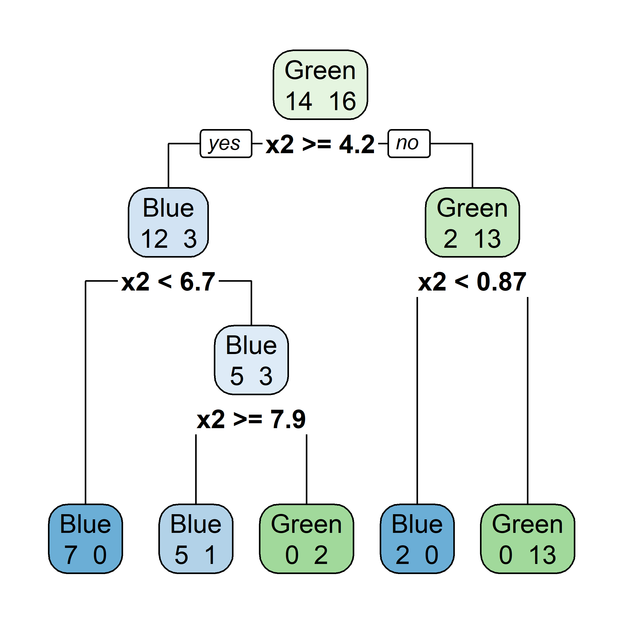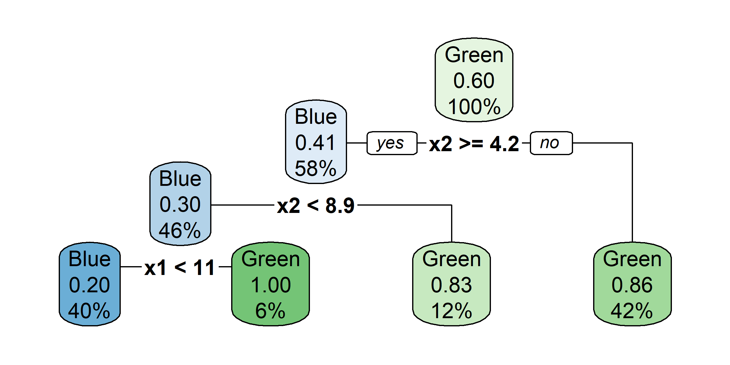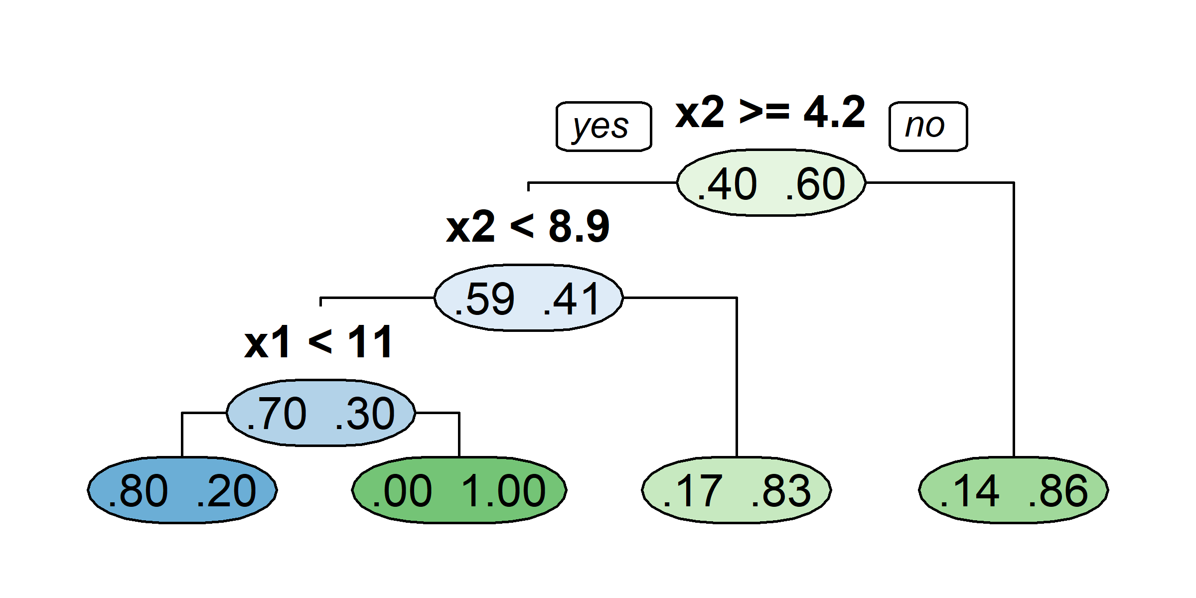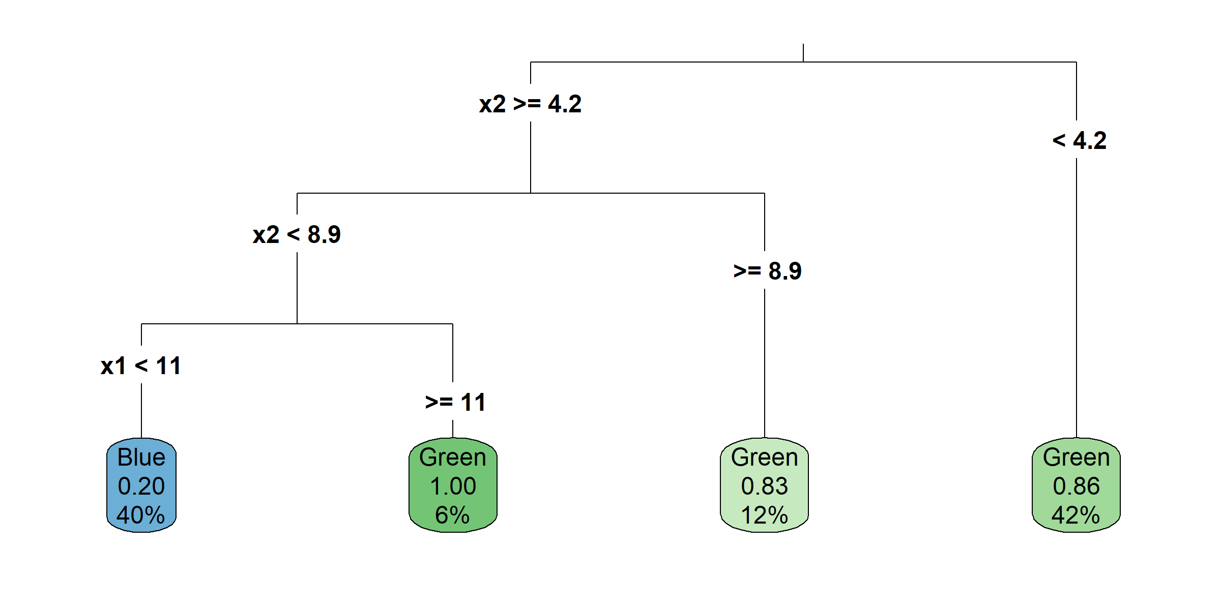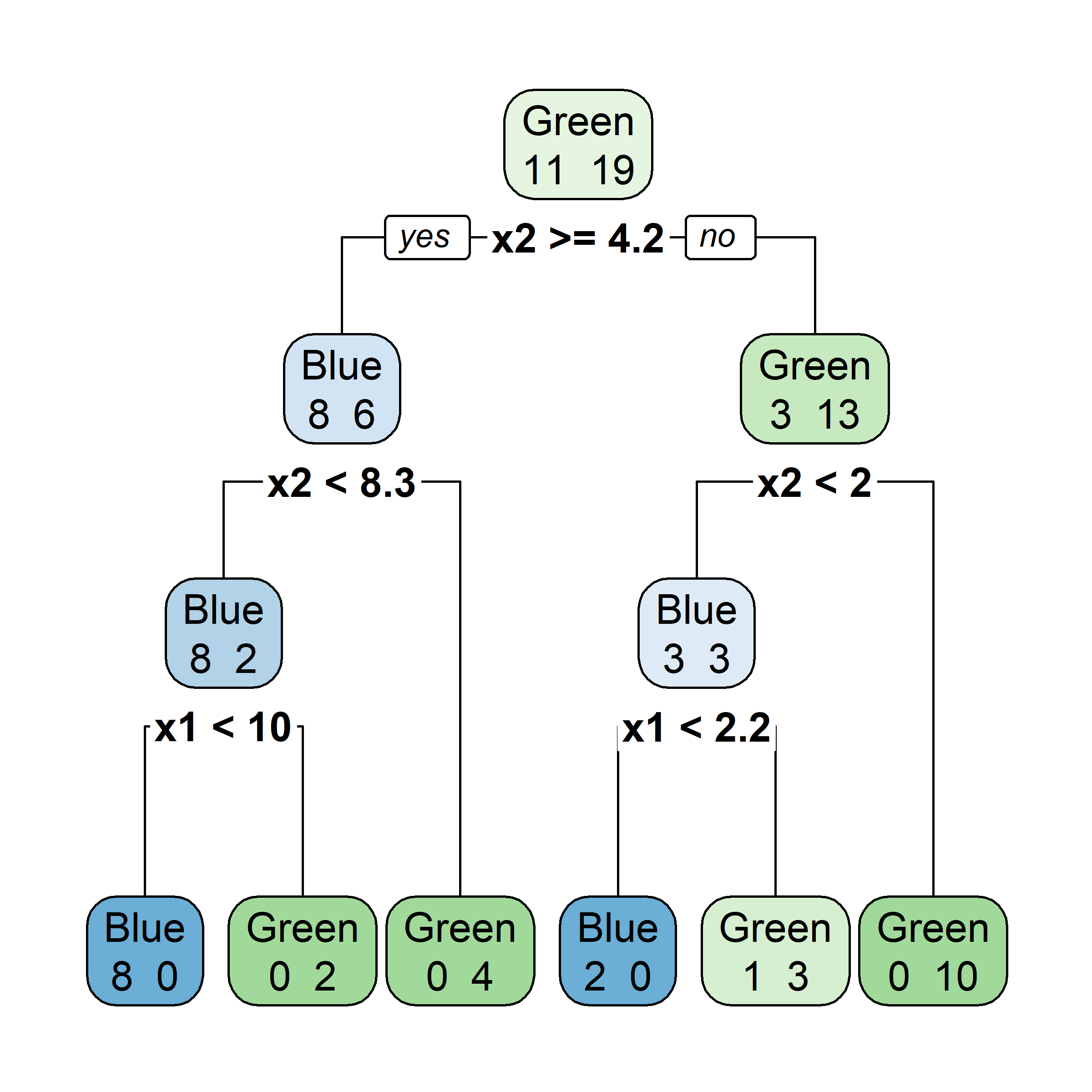 Repeat this splitting process (always turning one leaf into two), until a stopping criterion is reached (e.g., each leaf contains \leq 5 observations).