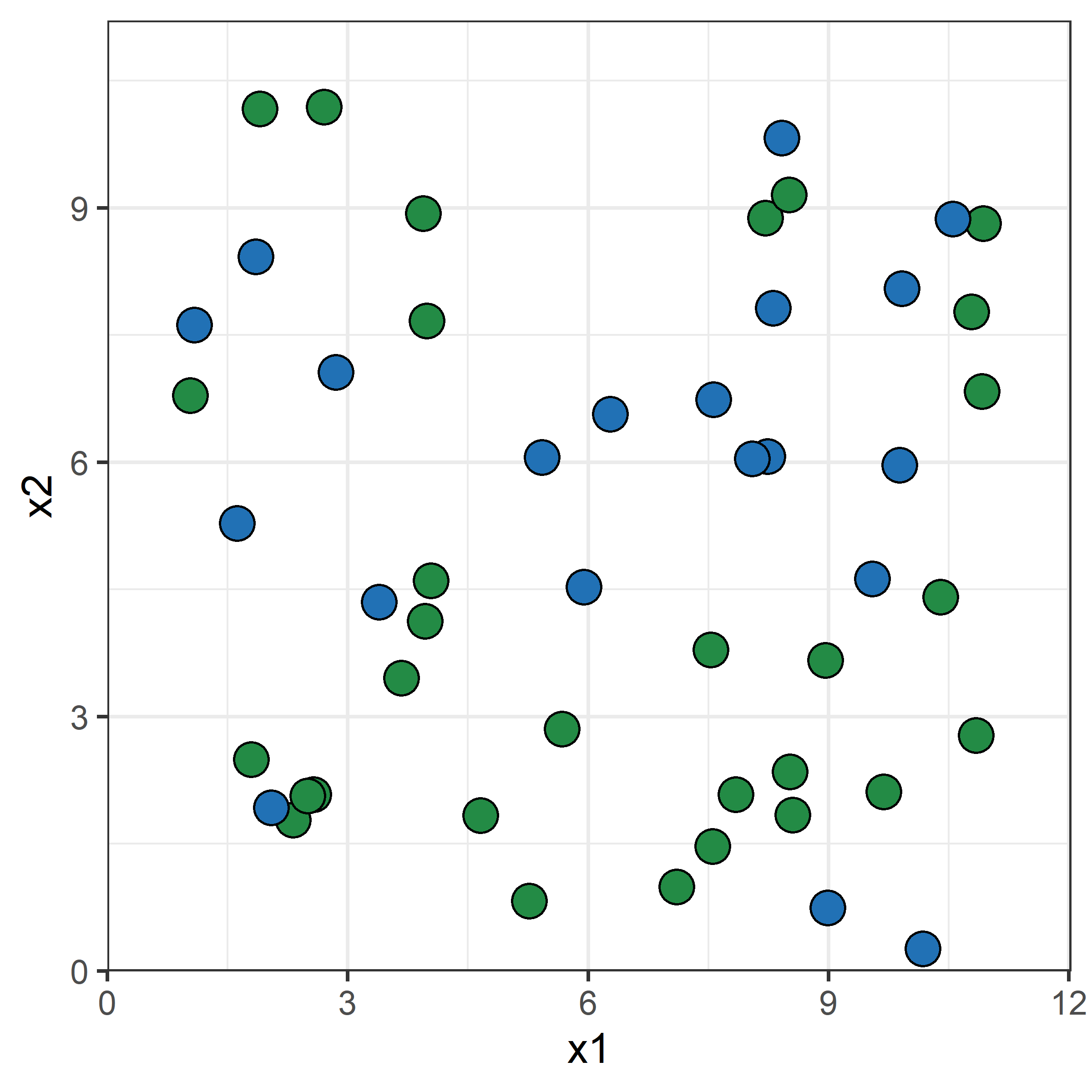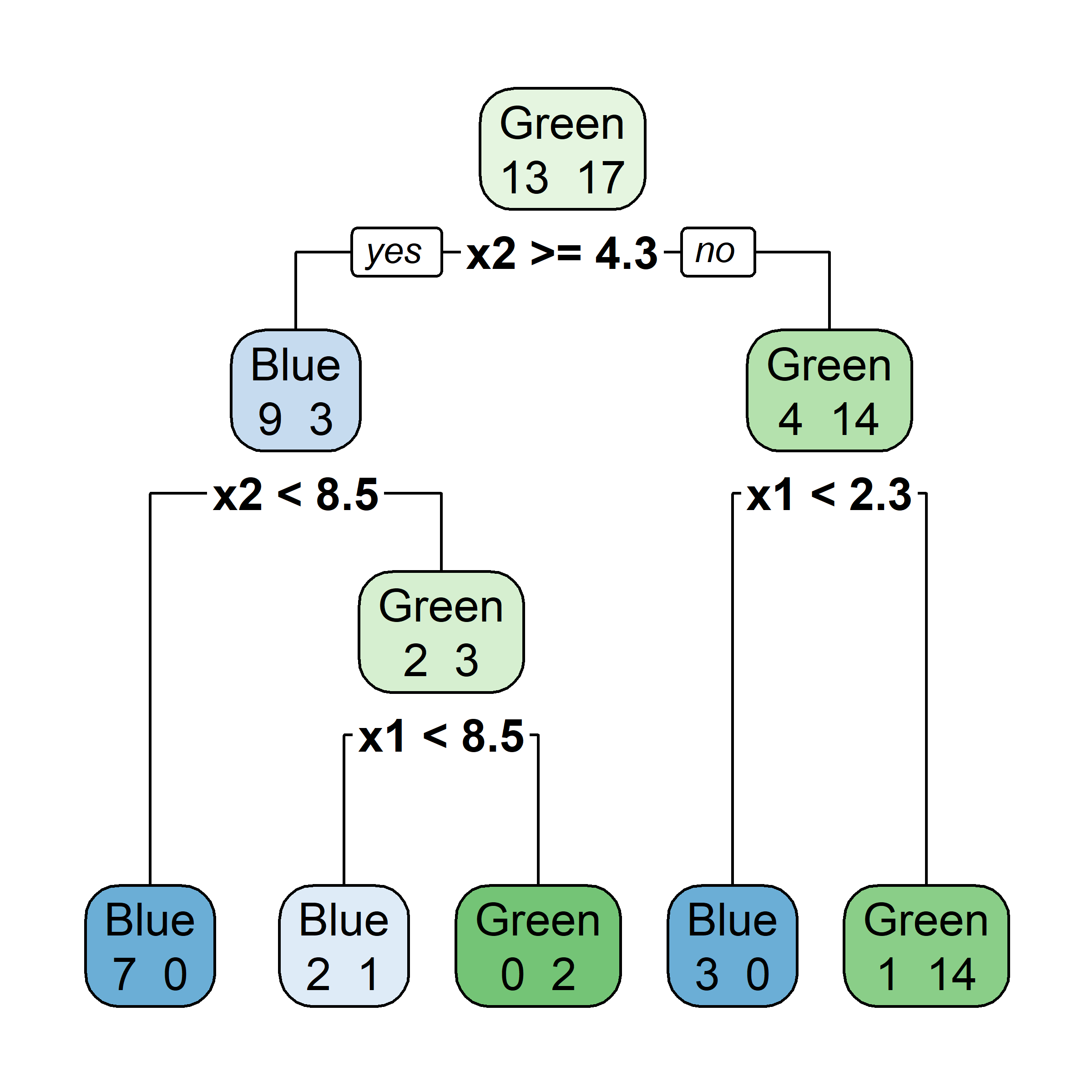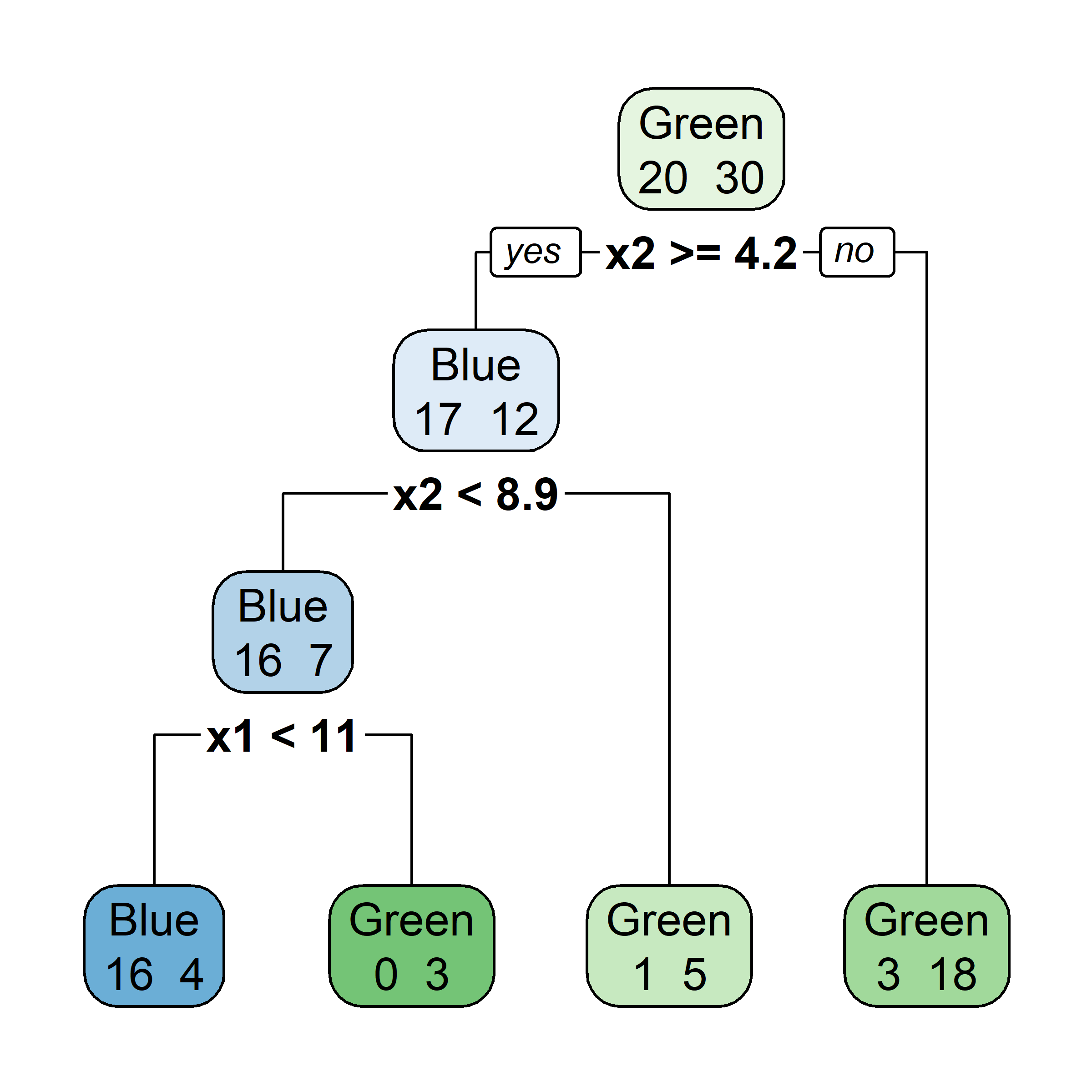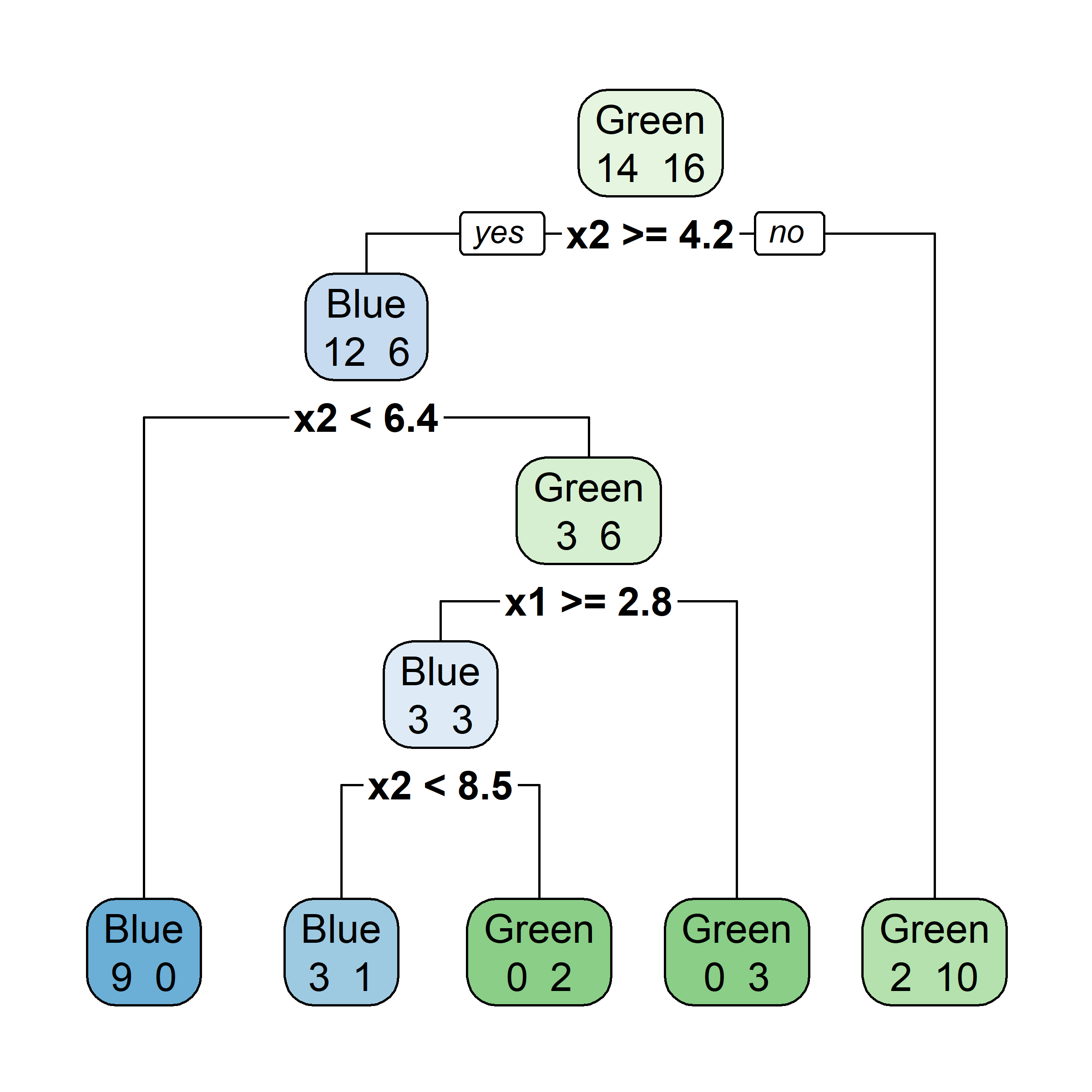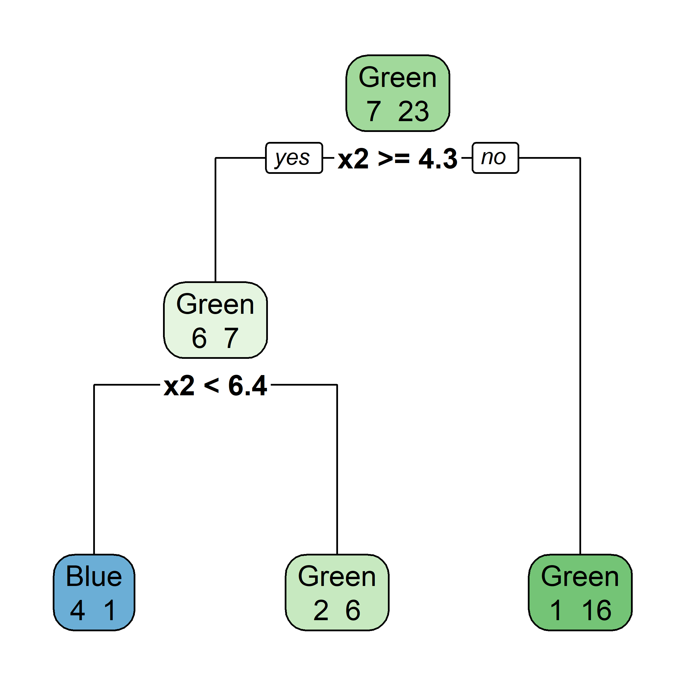 Repeat this splitting process (always turning one leaf into two), until a stopping criterion is reached (e.g., each leaf contains \leq 5 observations).