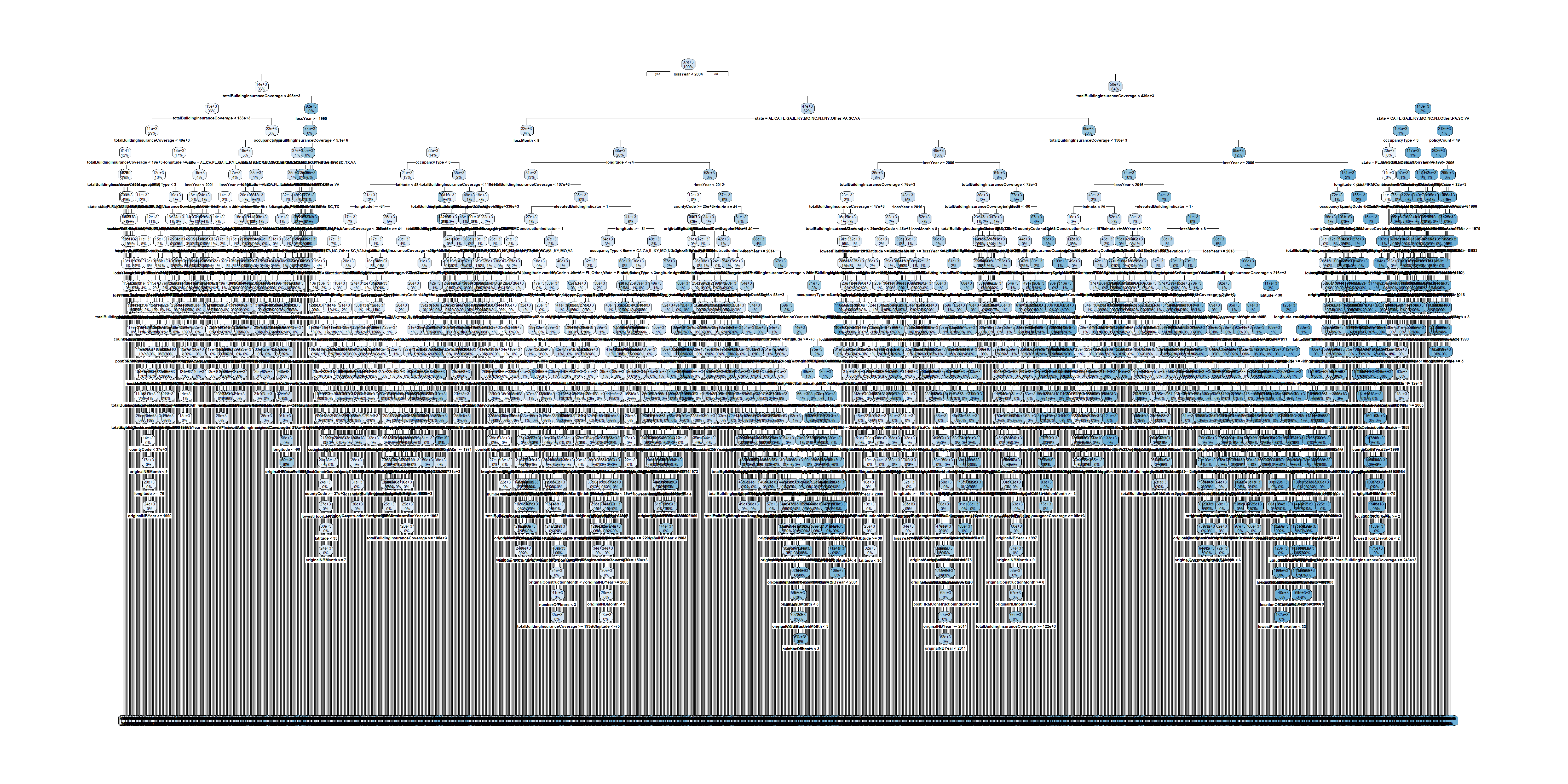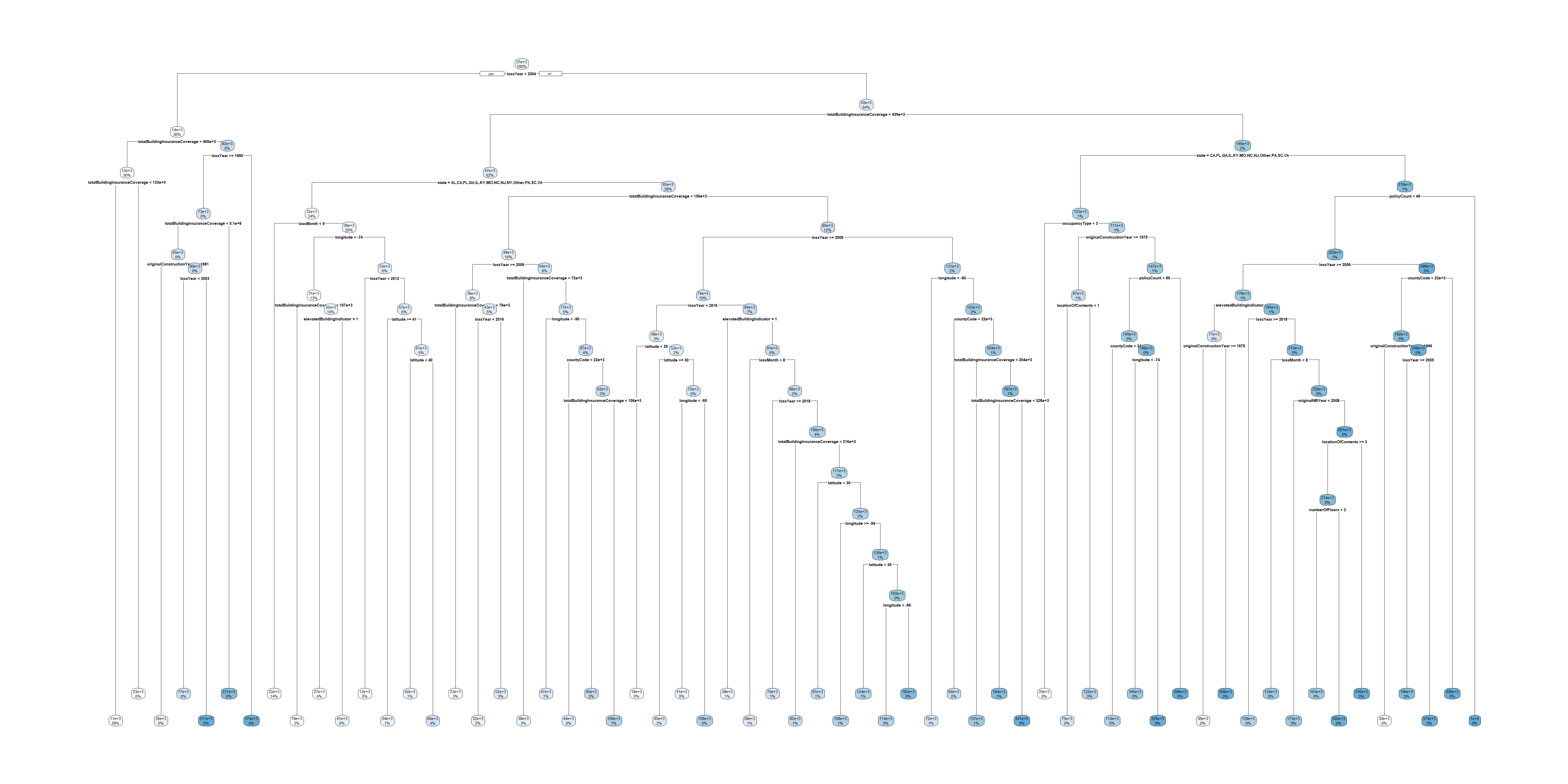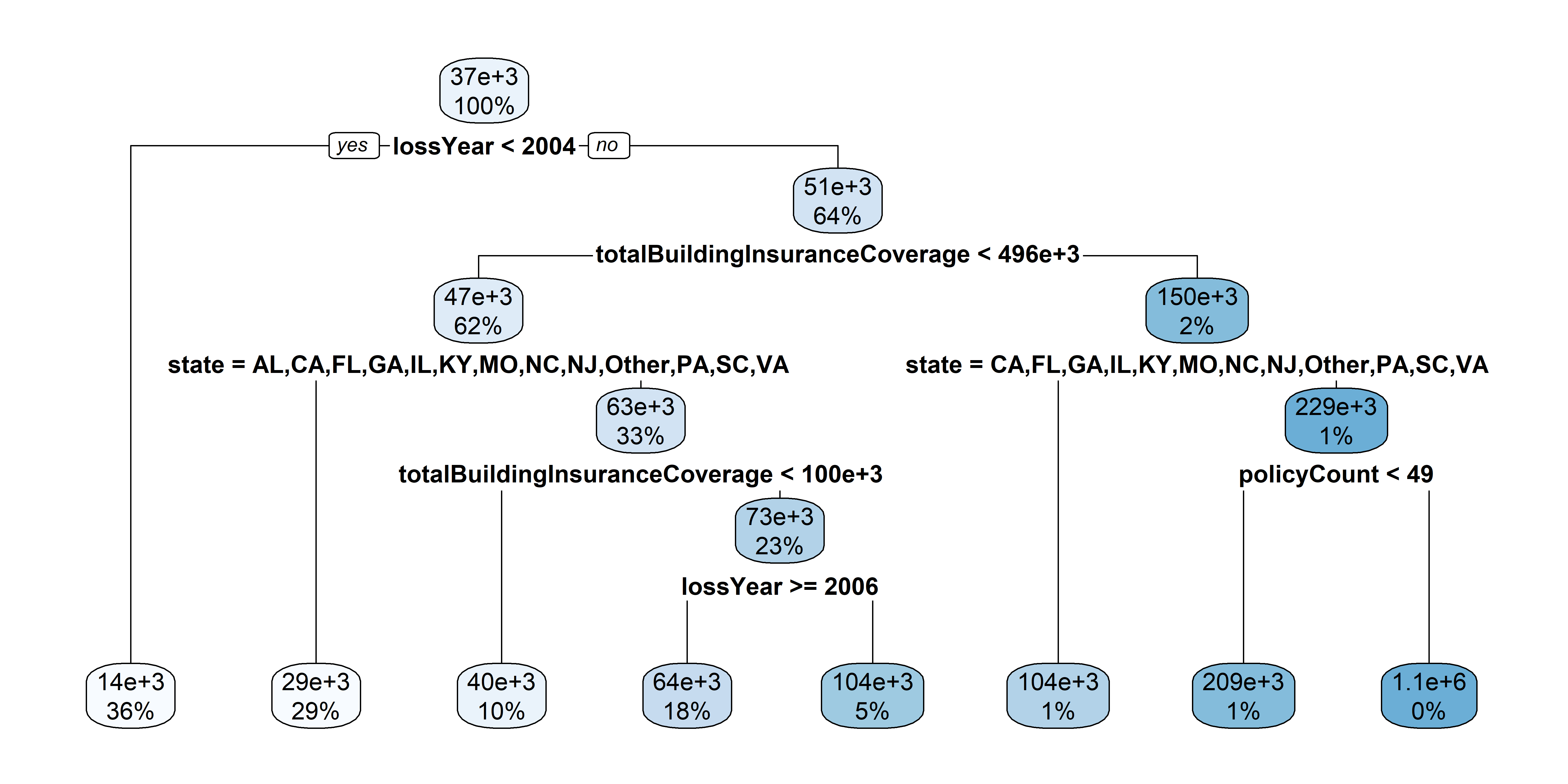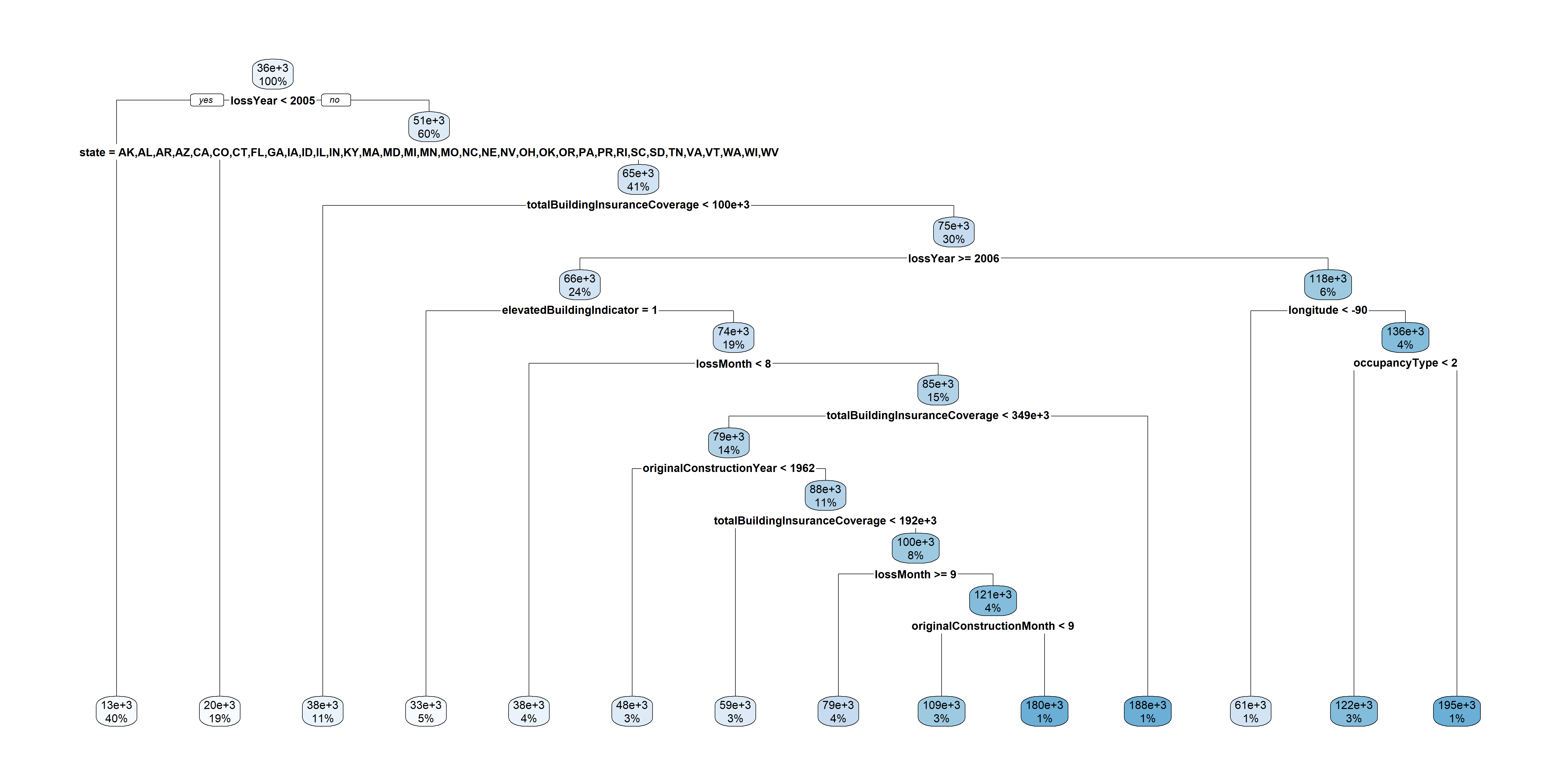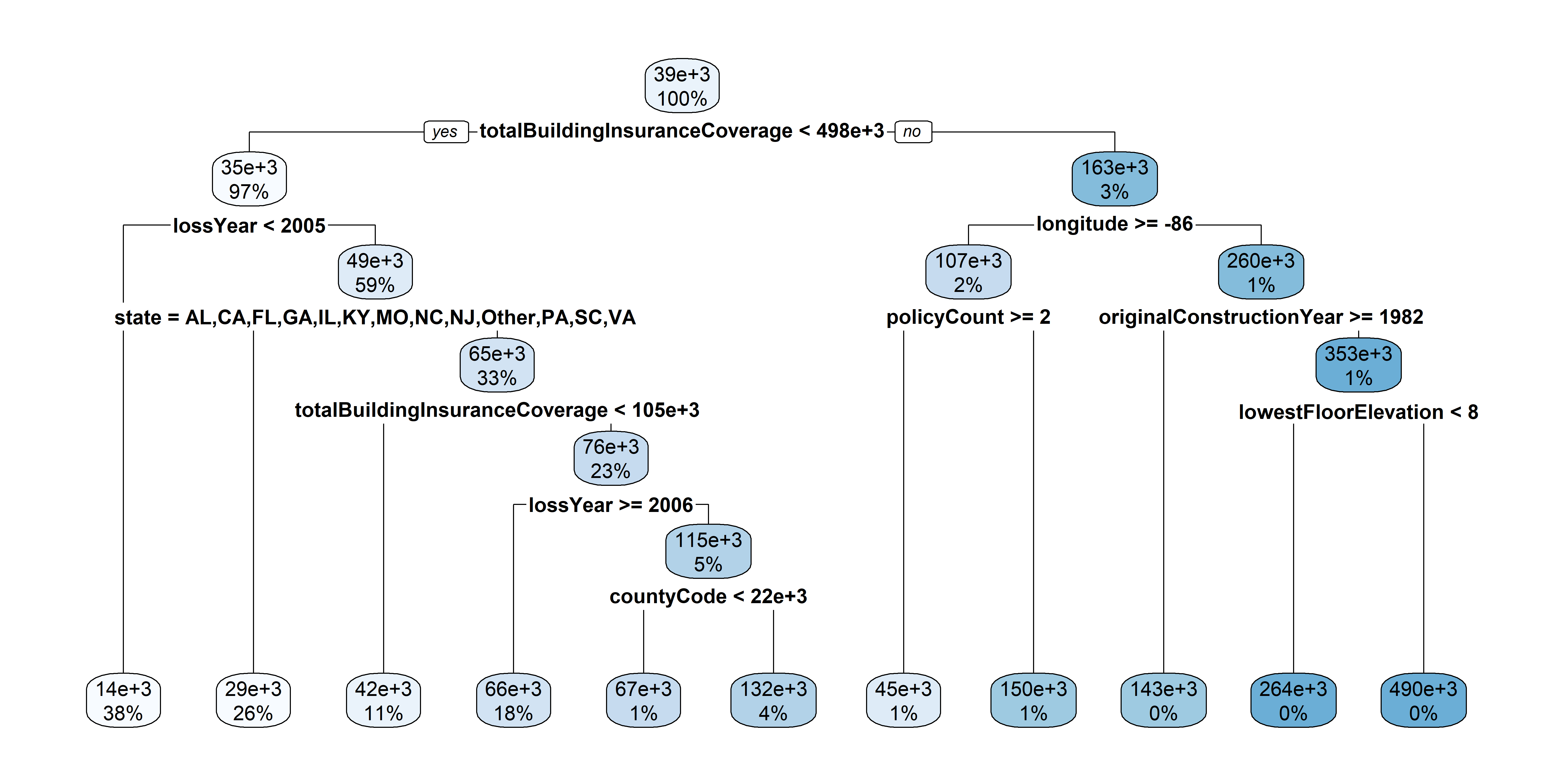 tree <-rpart(amountPaidOnBuildingClaim ~ ., data=claims[1:50000,])rpart.plot(tree)