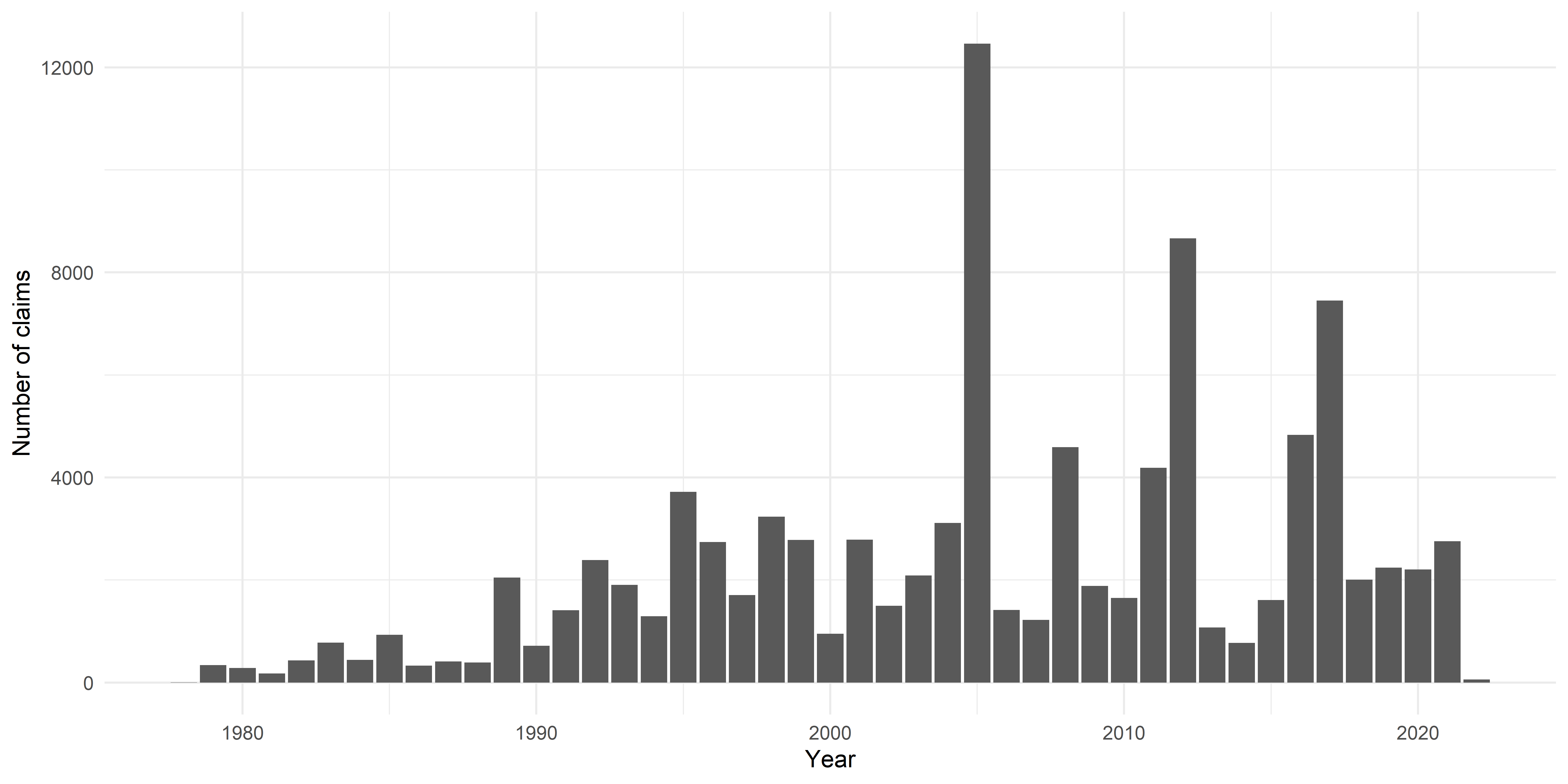 claims %>%group_by(lossYear) %>%summarise(n =n()) %>%ggplot(aes(x = lossYear, y = n)) +geom_bar(stat ="identity") +theme_minimal() +labs(x ="Year", y ="Number of claims")