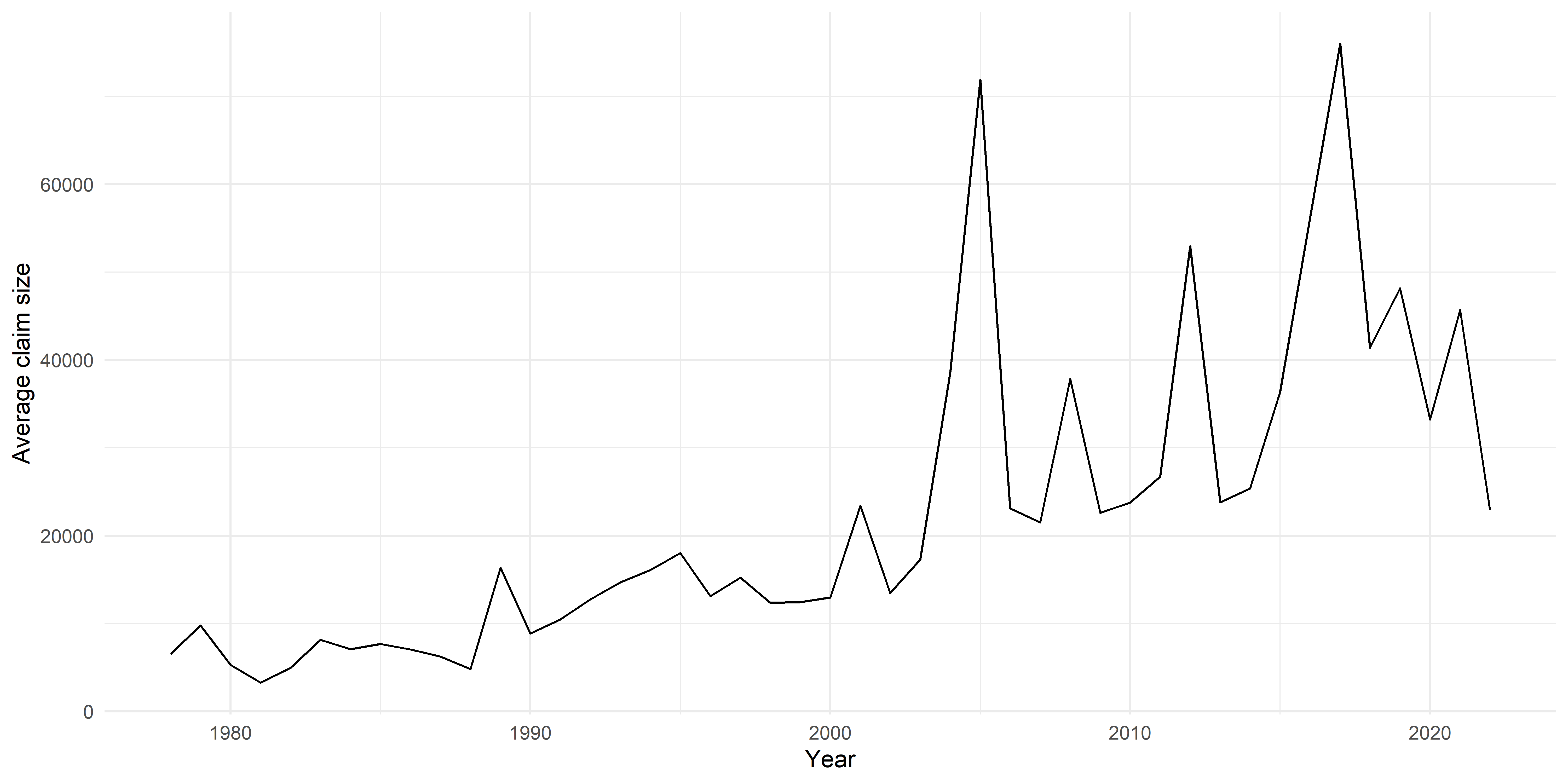 claims %>%group_by(lossYear) %>%summarise(mean_claim =mean(amountPaidOnBuildingClaim)) %>%ggplot(aes(x = lossYear, y = mean_claim)) +geom_line() +theme_minimal() +labs(x ="Year", y ="Average claim size")