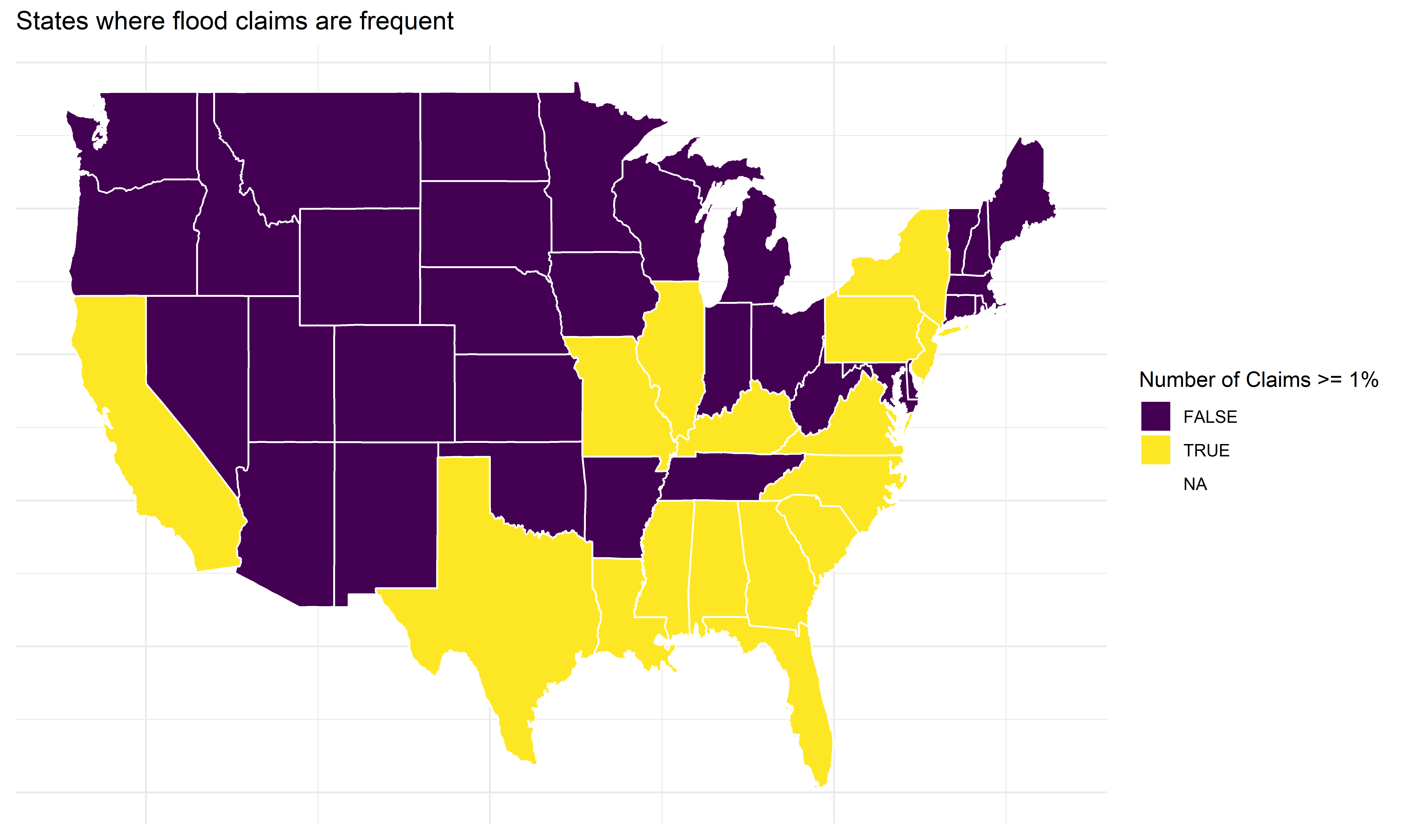 claims$state_full <- state.name[match(claims$state, state.abb)]state_claims <- claims %>%group_by(state_full) %>%summarise(num_claims =n(),max_claim_size =max(amountPaidOnBuildingClaim),common = num_claims >=nrow(claims) /100)claims$state_full <-NULL# Merge with the map datastates_map <-map_data("state")state_claims$region <-tolower(state_claims$state_full)states_map <-left_join(states_map, state_claims, by ="region")